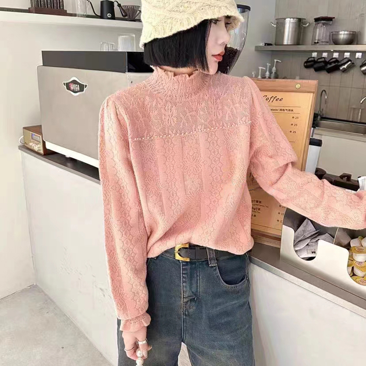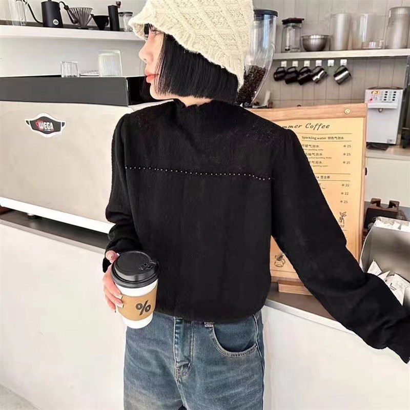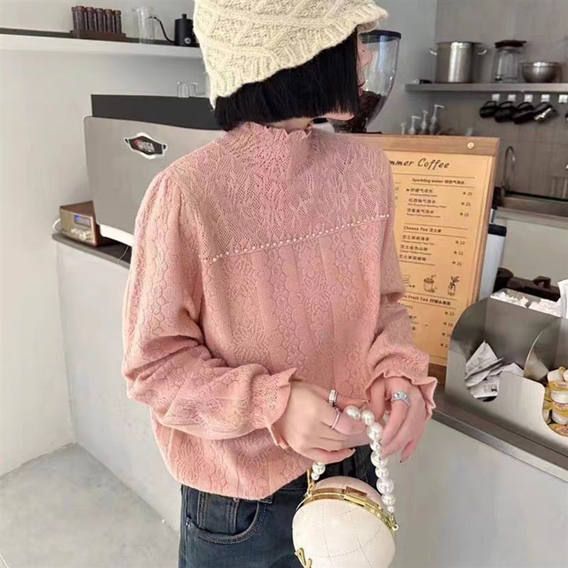 半高领蕾丝打底衫女秋冬季2024新款洋气高级感钉珠内搭针织衫上衣