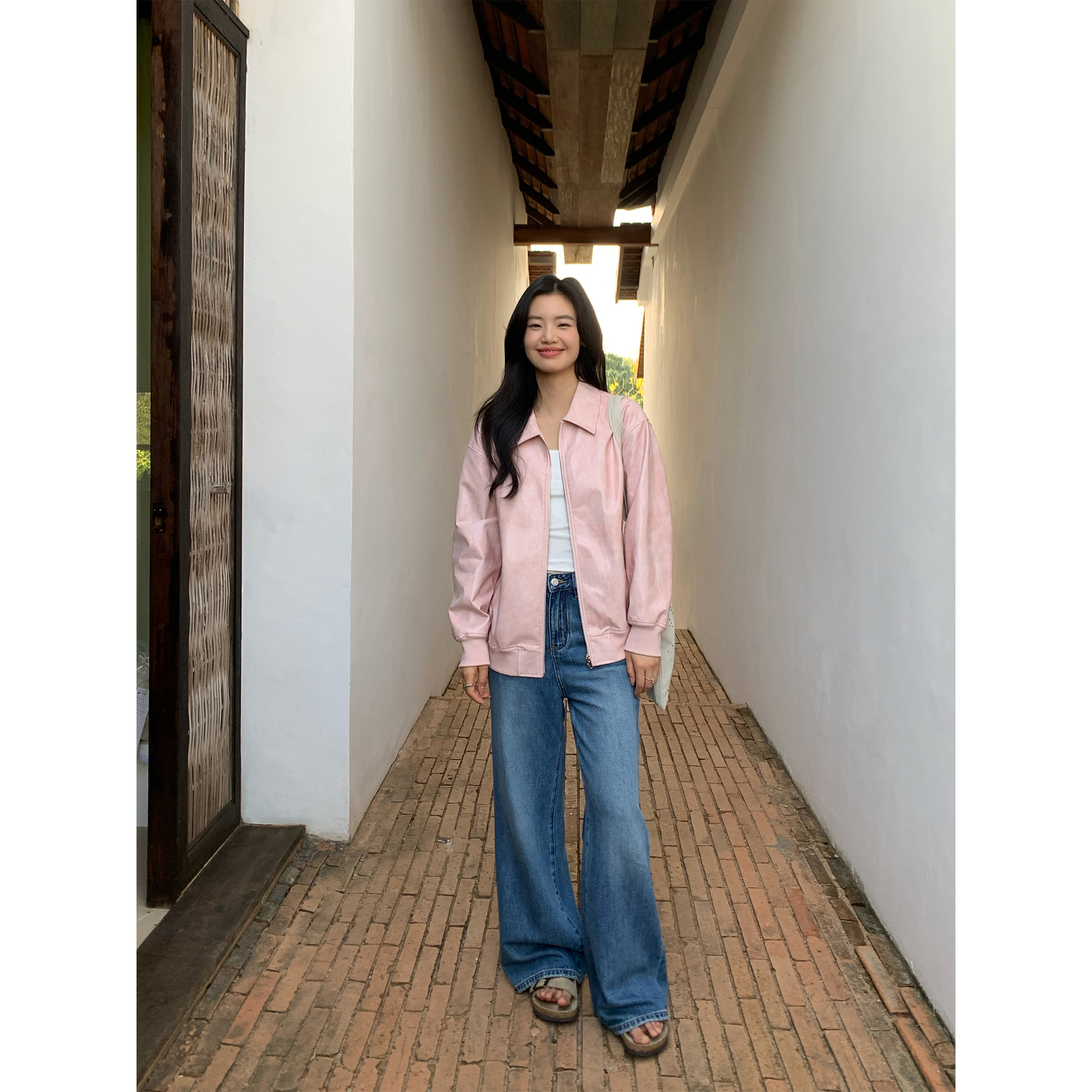 pusumede 甜酷女孩 粉色减龄pu皮衣女翻领拉链夹克设计感小众上衣