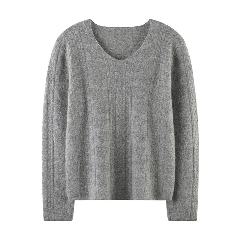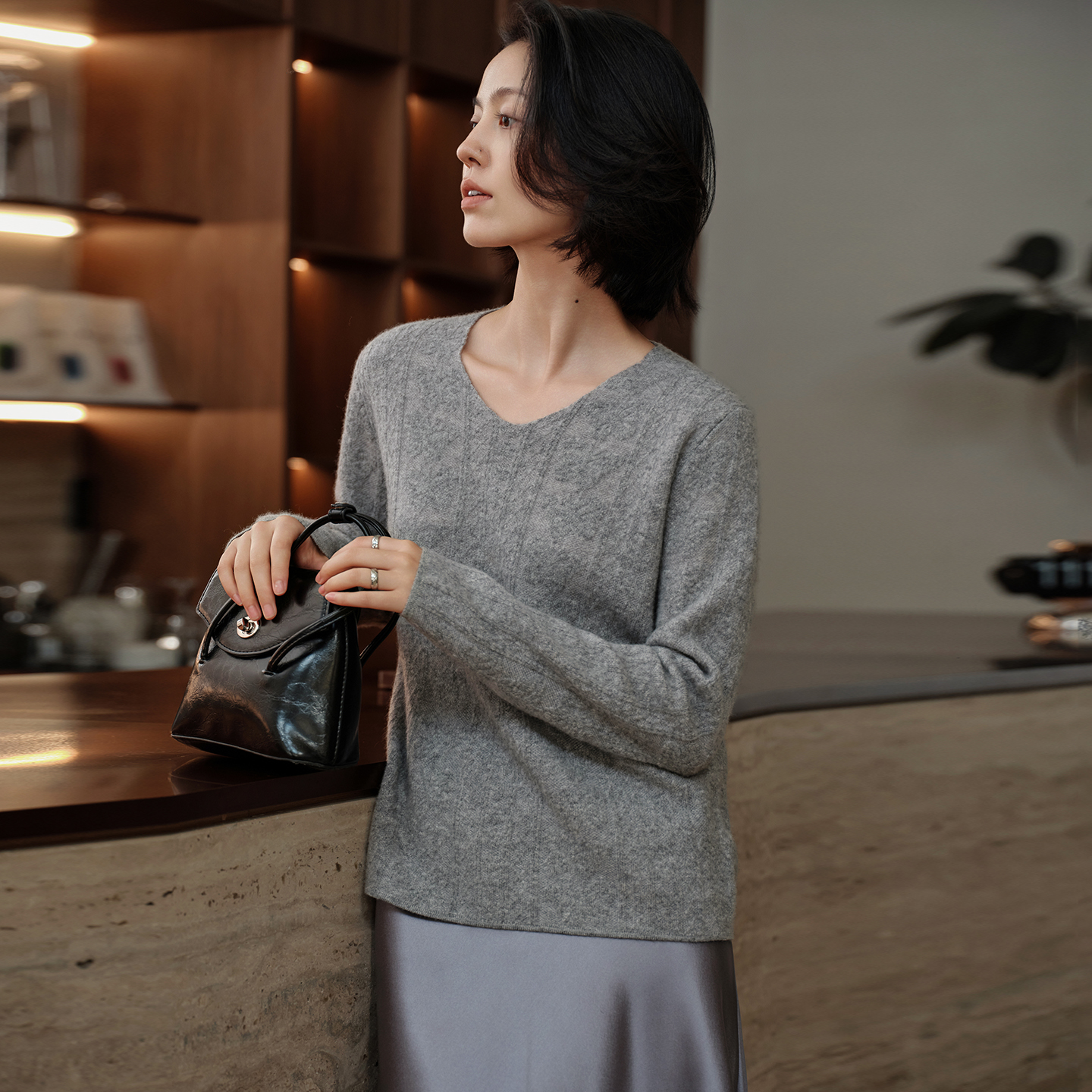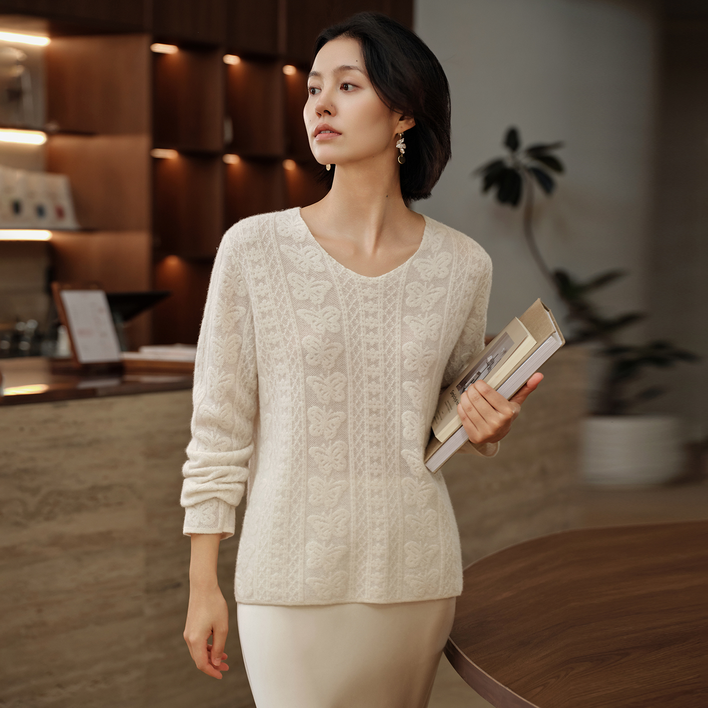 轻奢100%山羊绒衫女V领提花宽松显瘦百搭欧根纱针织打底内搭毛衣