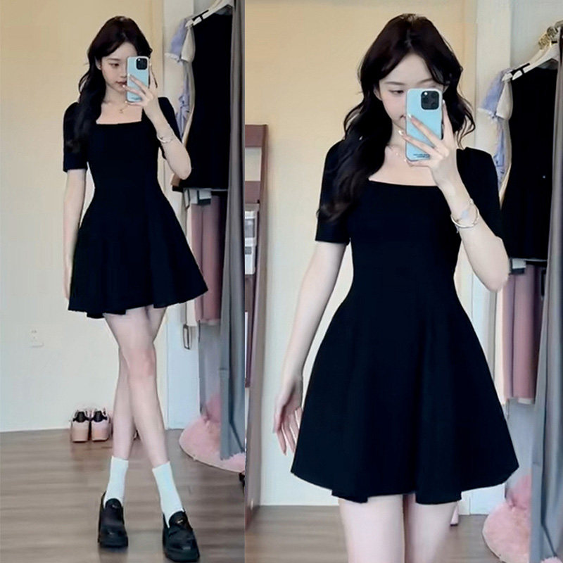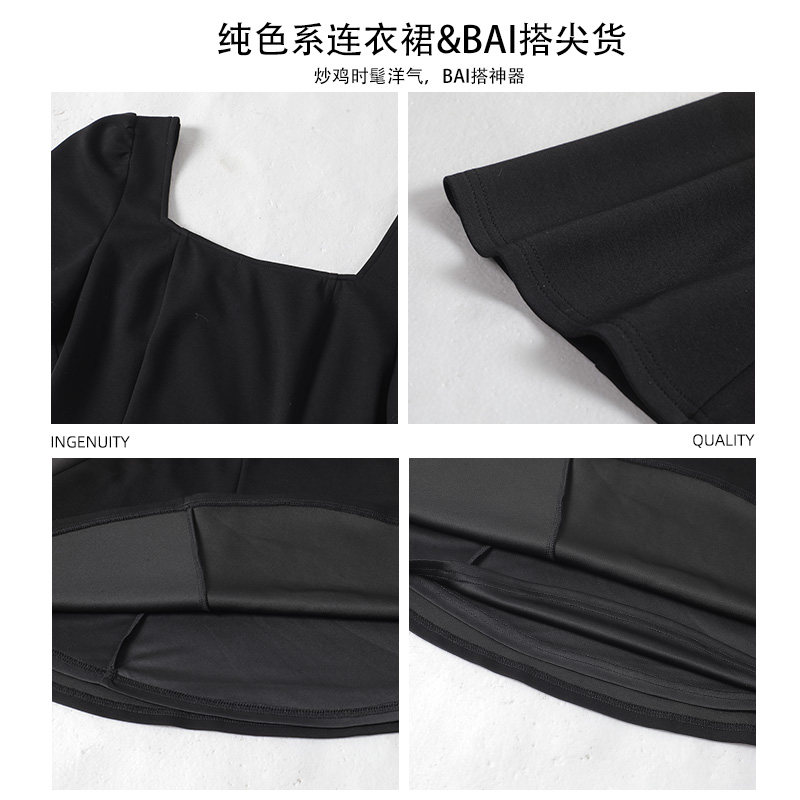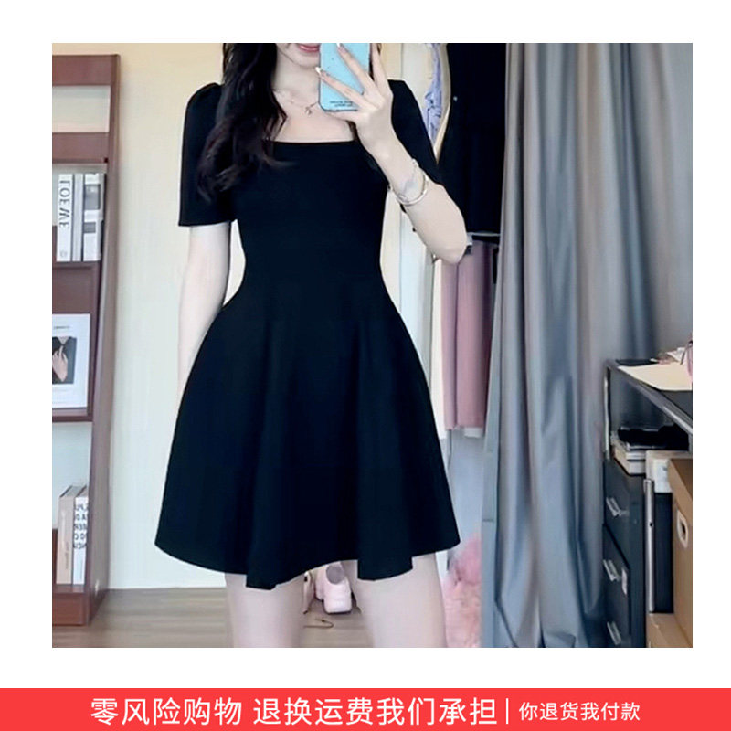 法式赫本风高级感方领黑色收腰连衣裙子女夏2024新款a字蓬蓬短裙