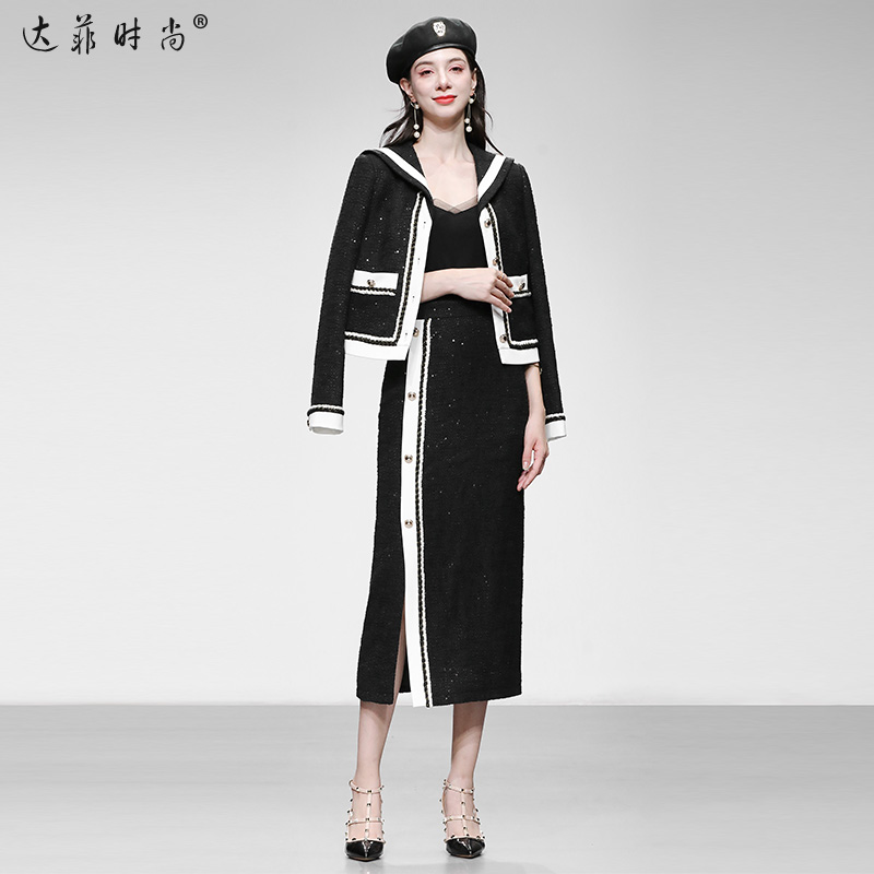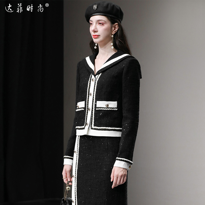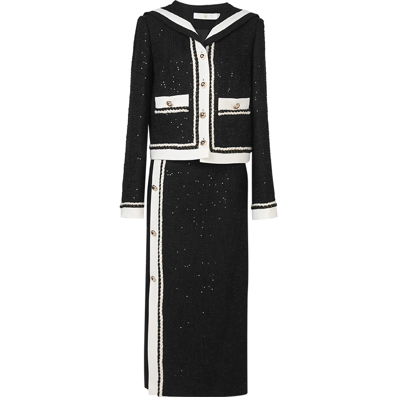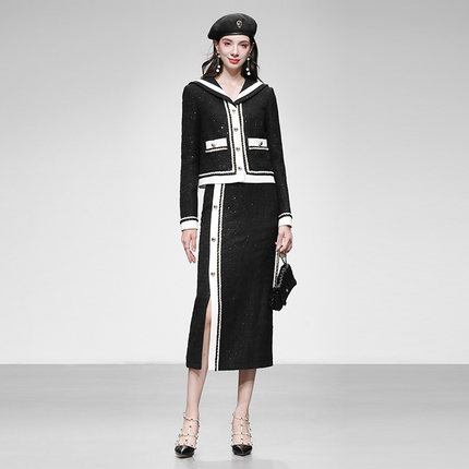2025年秋冬新款气质海军风撞色亮片粗花呢外套+修身开衩半裙套装