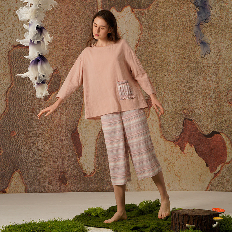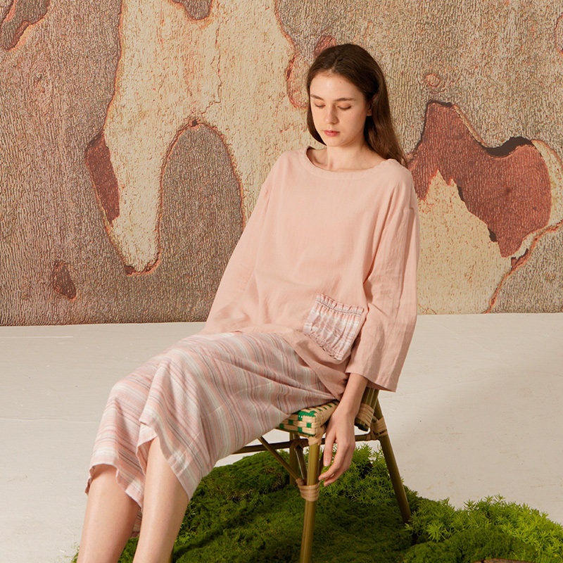 3.5折清仓朵朵可可睡衣春夏棉麻甜美套头镂空七分袖条纹家居服