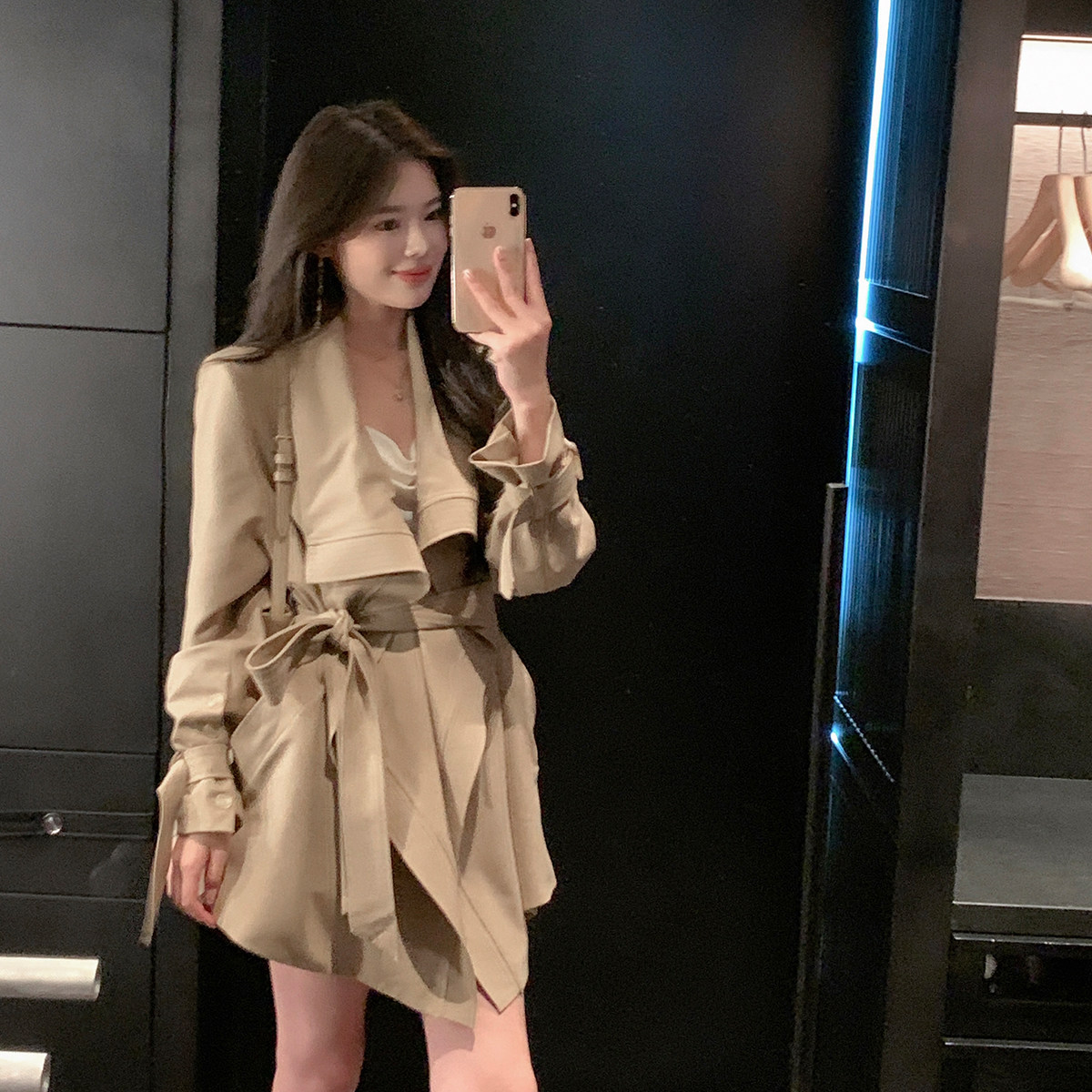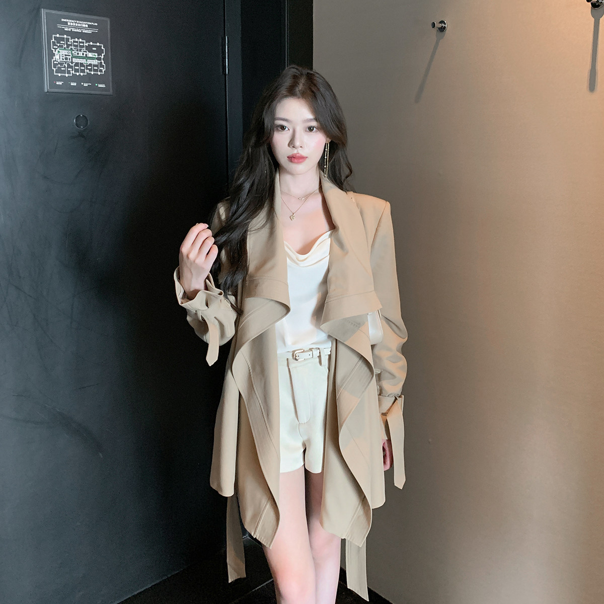 ByYou 冬季新款气质卡其色收腰风衣外套女短款宽松休闲大衣带垫肩
