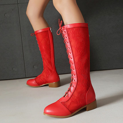 欧美外贸高筒网靴春秋系带镂空凉靴粗跟中跟白色红色大码女靴 ZYJ