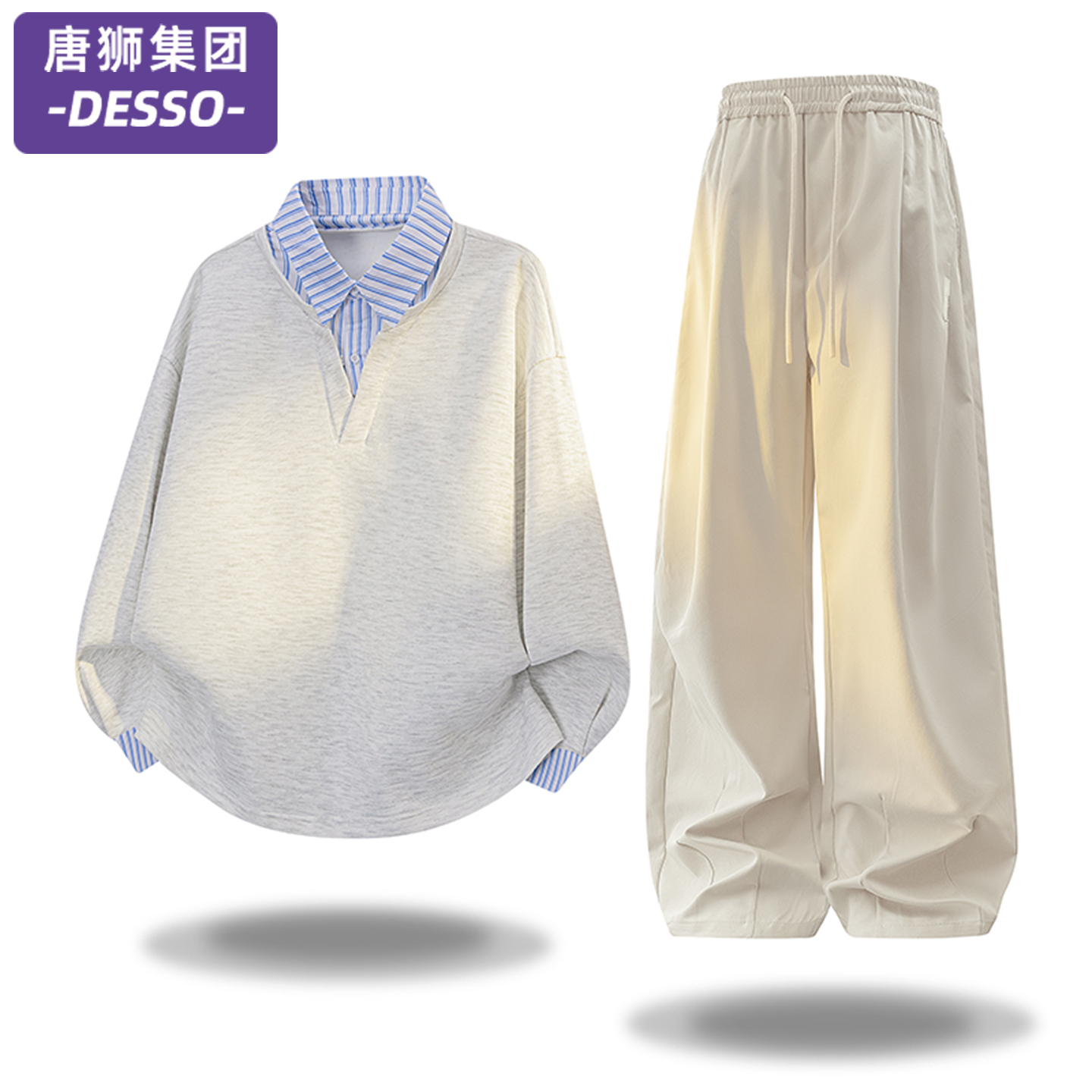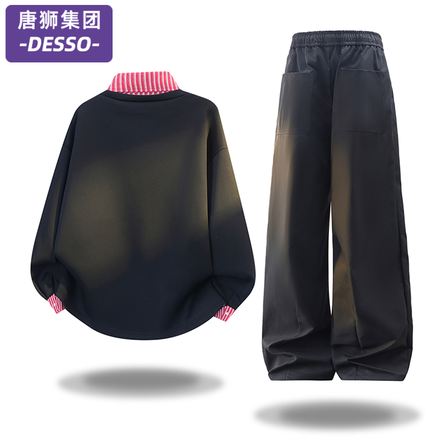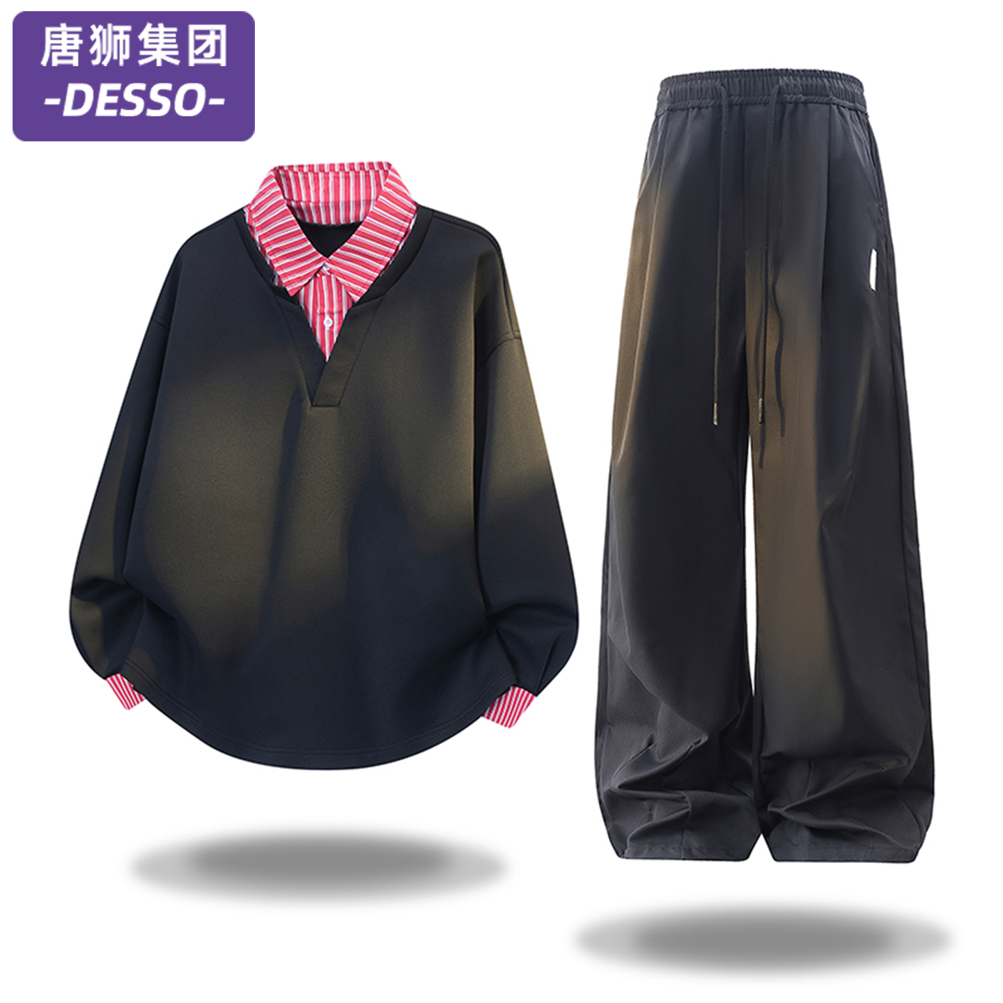 唐狮集团DESSO假两件拼接翻领套装男秋季潮牌宽松情侣休闲套头上