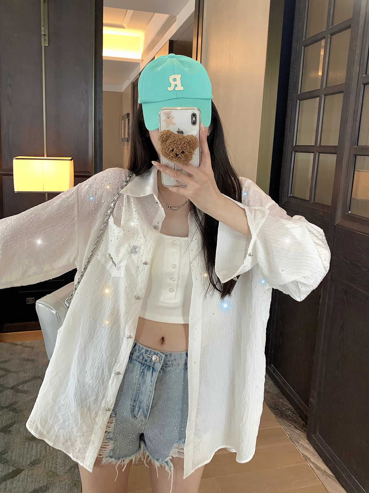 庄大泥 烫钻破洞高腰牛仔短裤女2025新款美式热辣高腰A字阔腿热裤