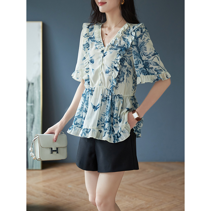 宝诗黎V领钉珠木耳边碎花雪纺衫女短袖2025新款宽松套头衬衣夏装
