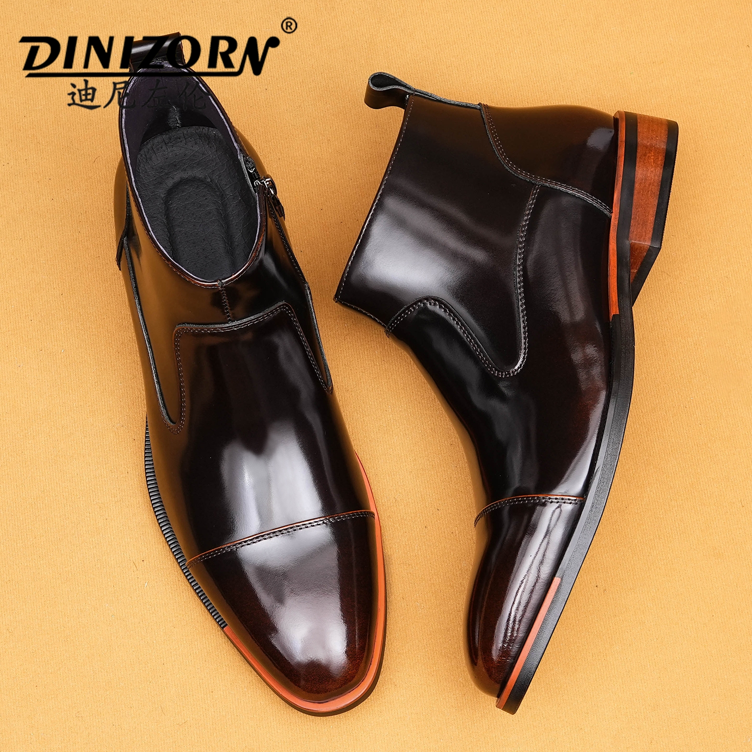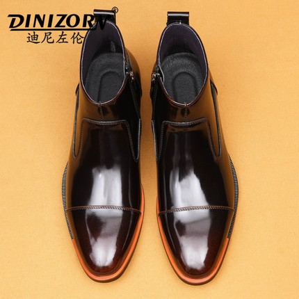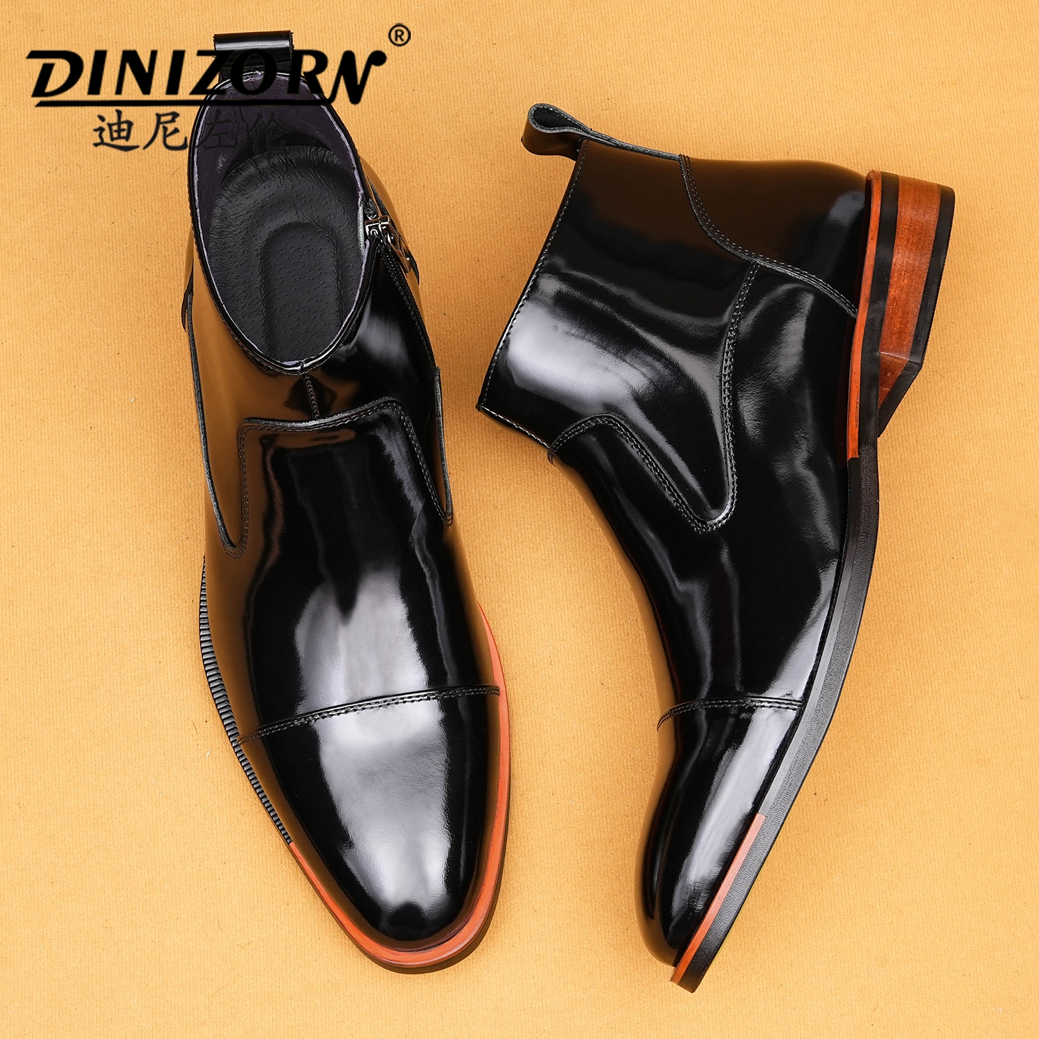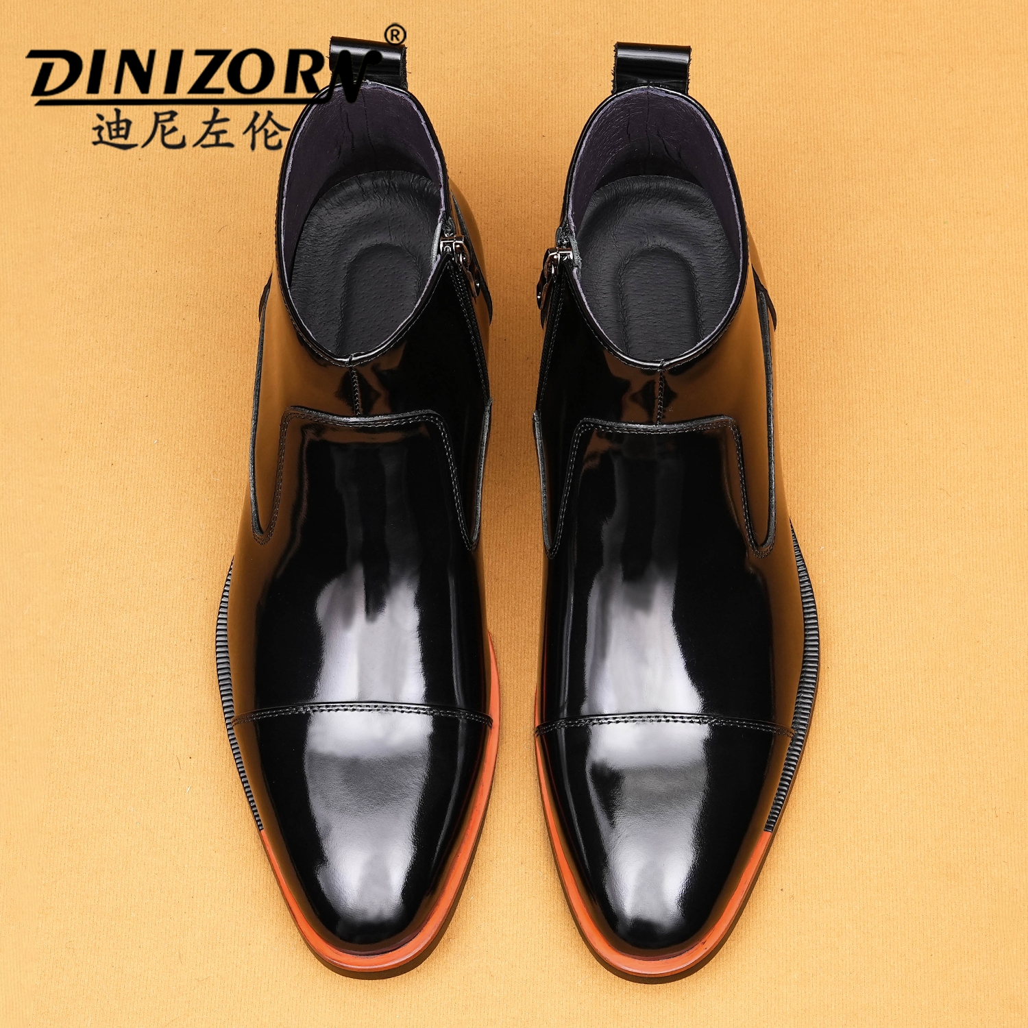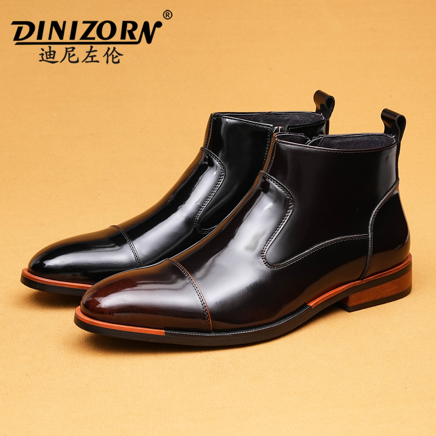 尖头切尔靴男短靴2025新款真皮亮面高帮皮鞋三接头英伦拉链马丁靴