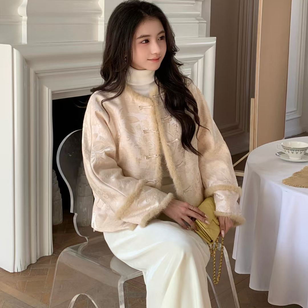 新中式羊毛缎面提花羽绒服女冬季复古盘扣轻奢水貂毛改良唐装上衣