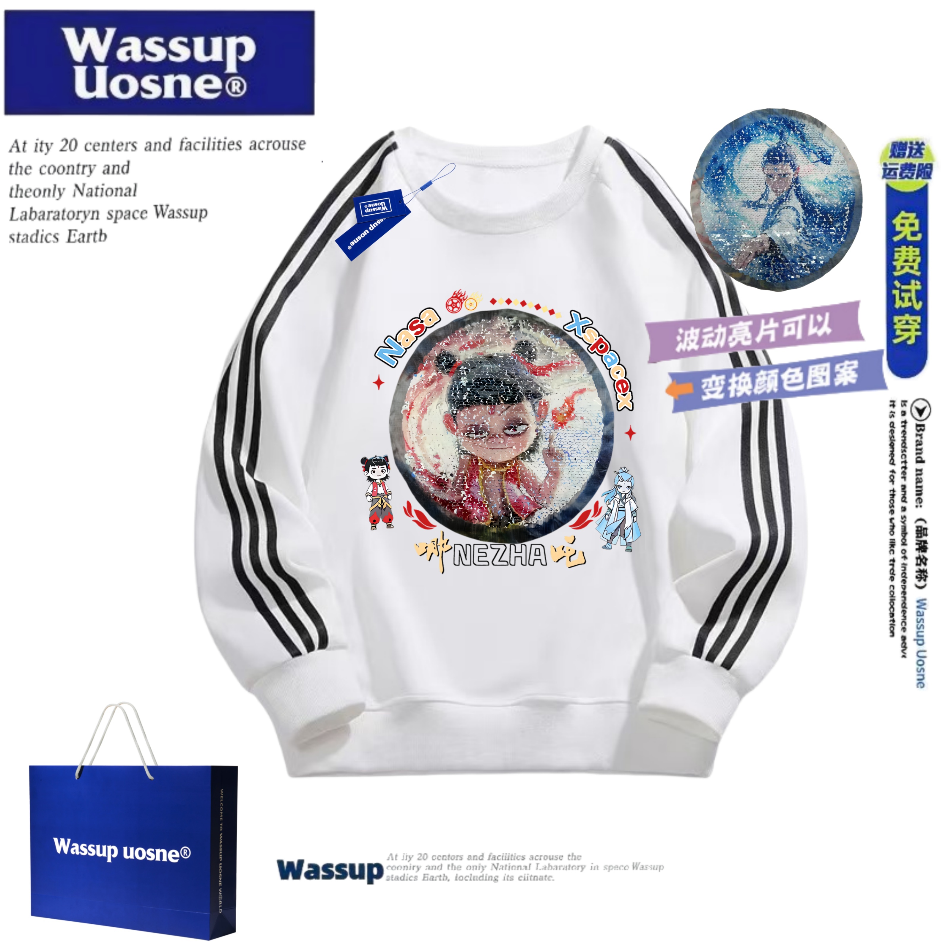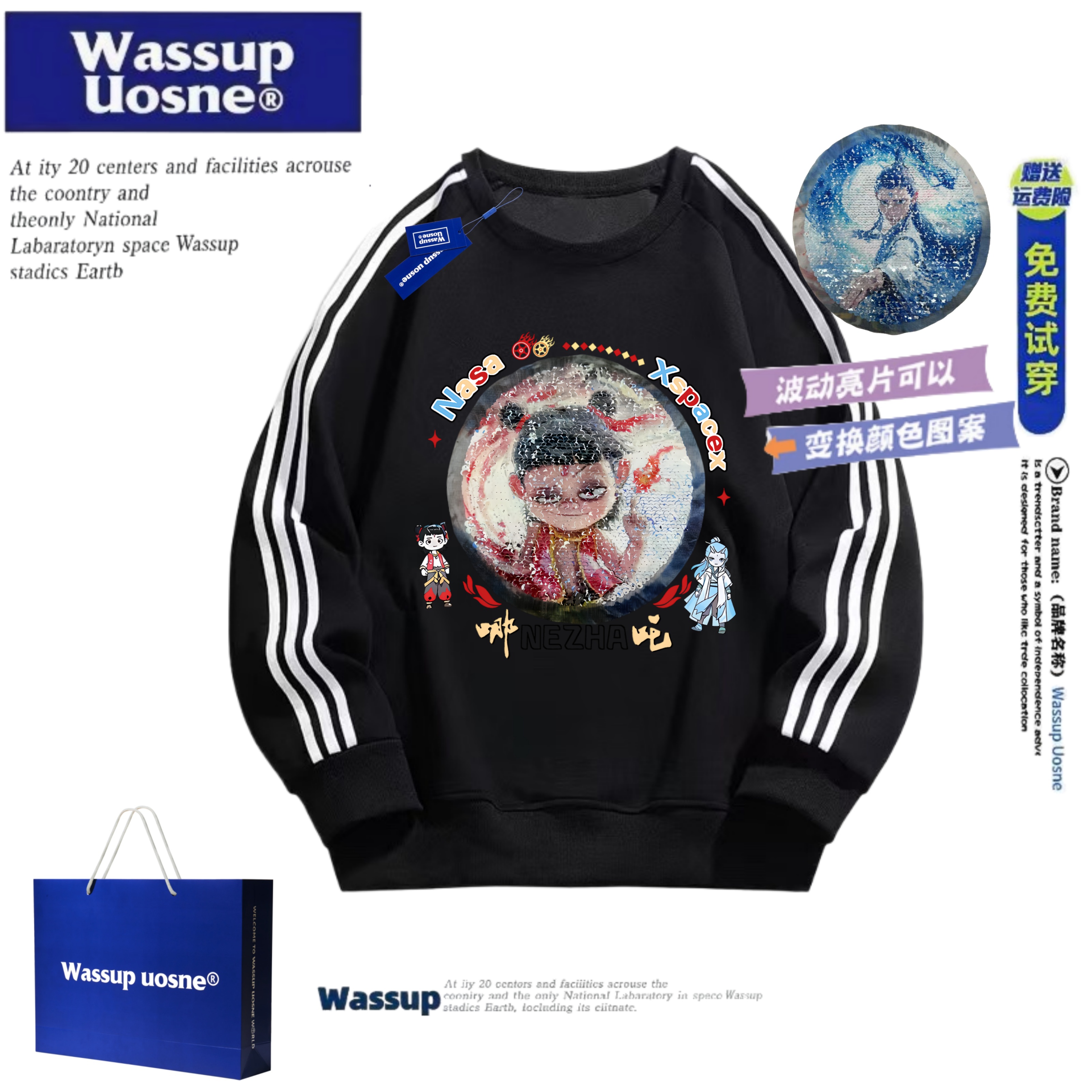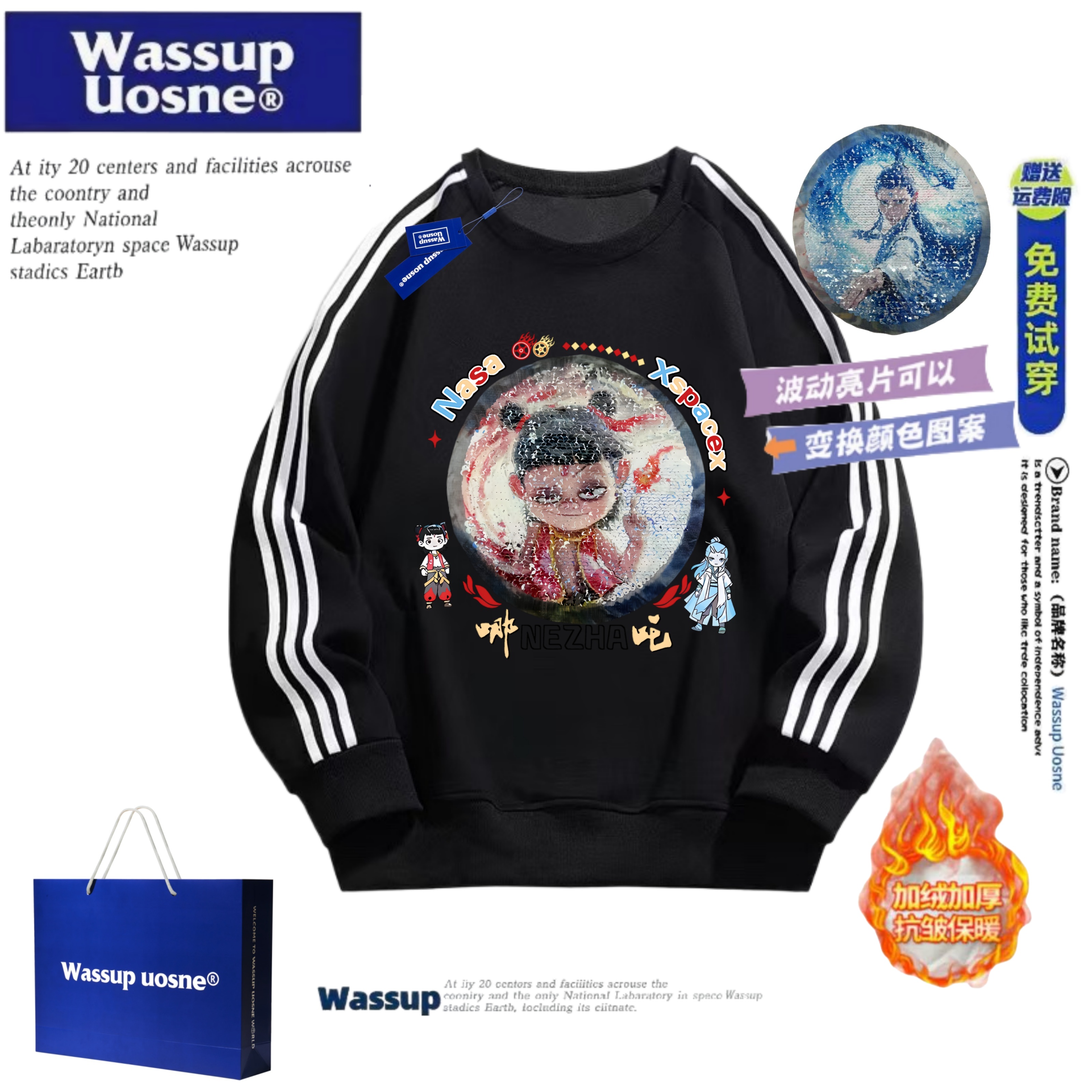 WASSUP联名男童哪吒敖丙亮片变脸卫衣儿童秋冬加绒女童撞色上衣潮