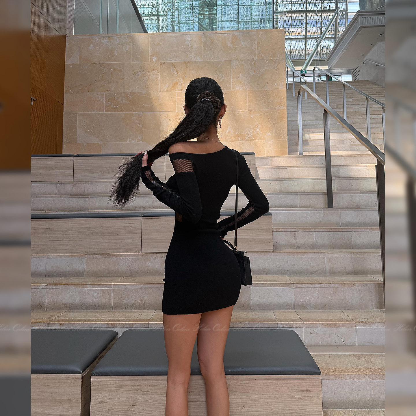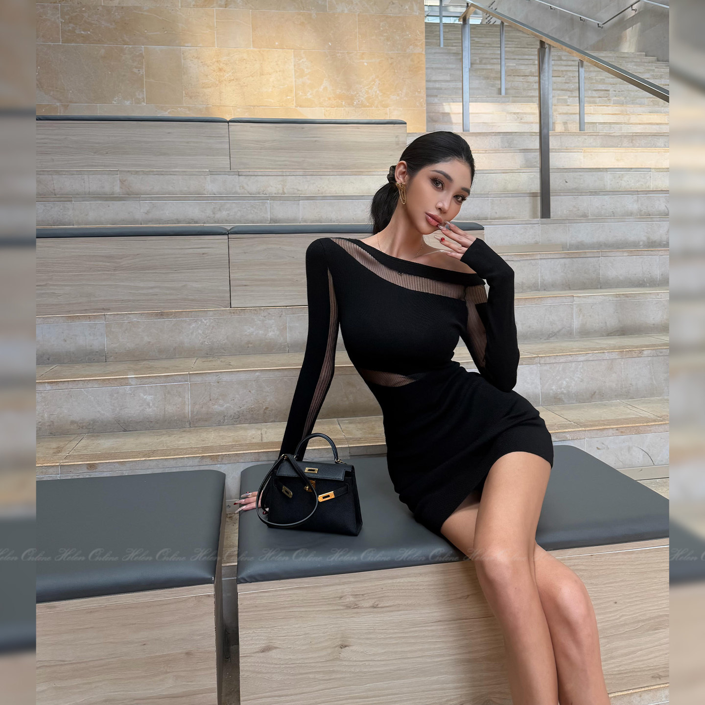 HELEN/小心机透视网纱拼接裙性感显瘦辣妹长袖针织镂空斜肩连衣裙