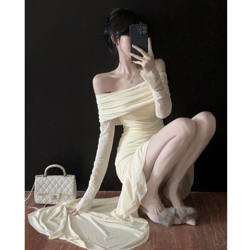 温柔风法式漂亮独特连衣裙设计感小众一字领鱼尾气质长裙春冬新款
