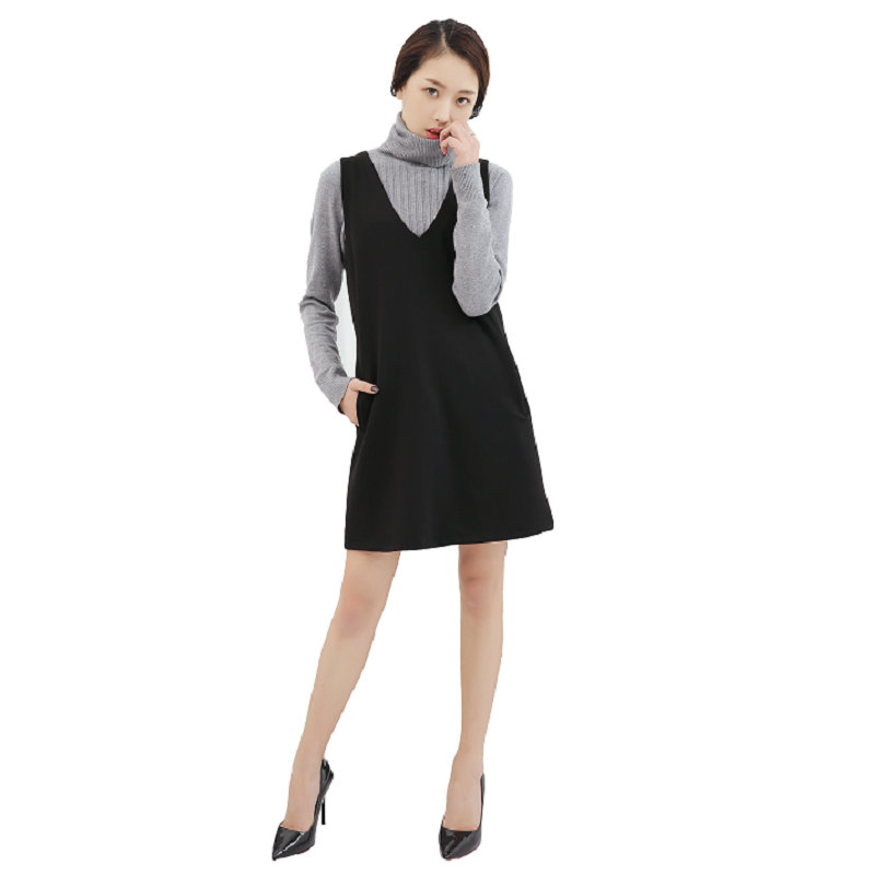 春夏黑色V领A字宽松罗马布棉无袖马甲中长款背心连衣裙女装外穿