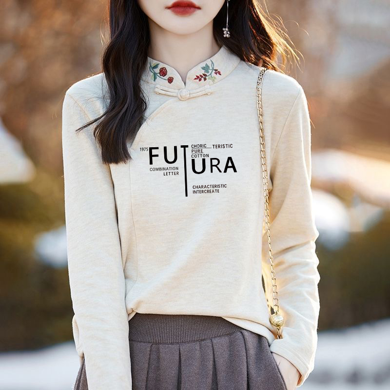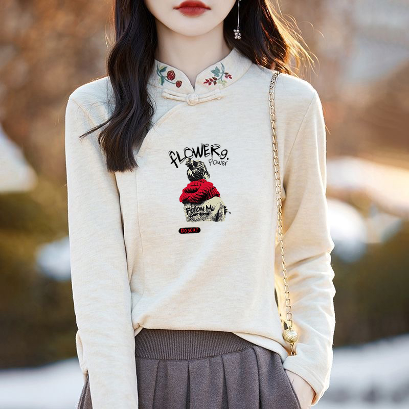 新中式加绒加厚打底衫女德绒立领刺绣内搭上衣冬季印花长袖t恤衫