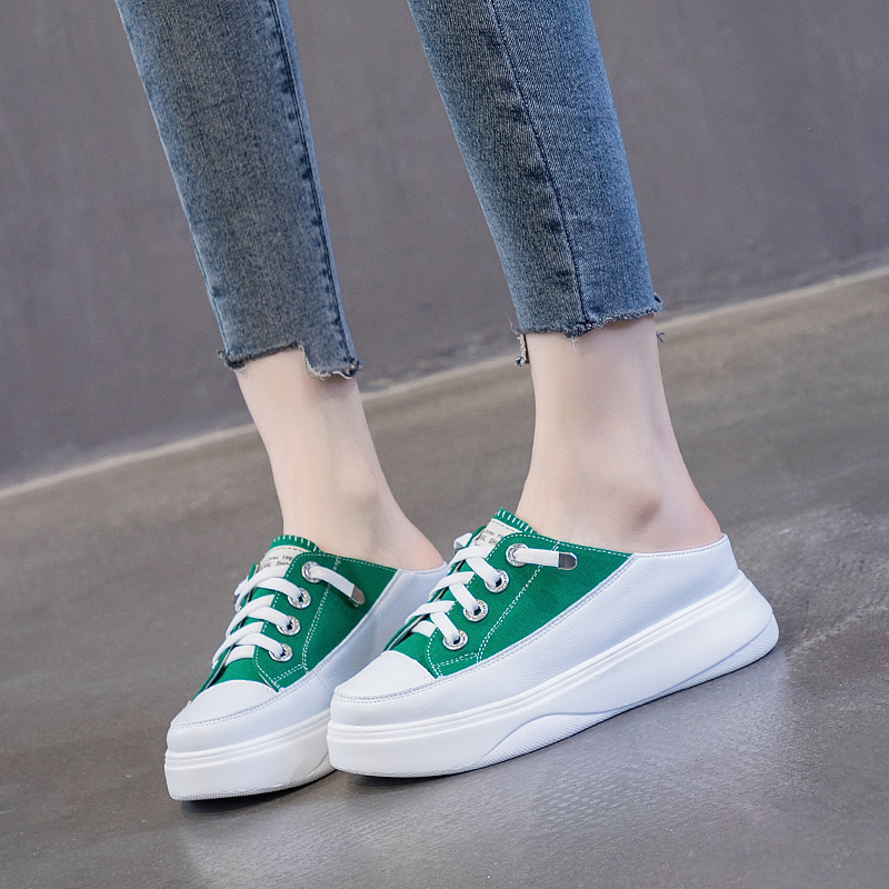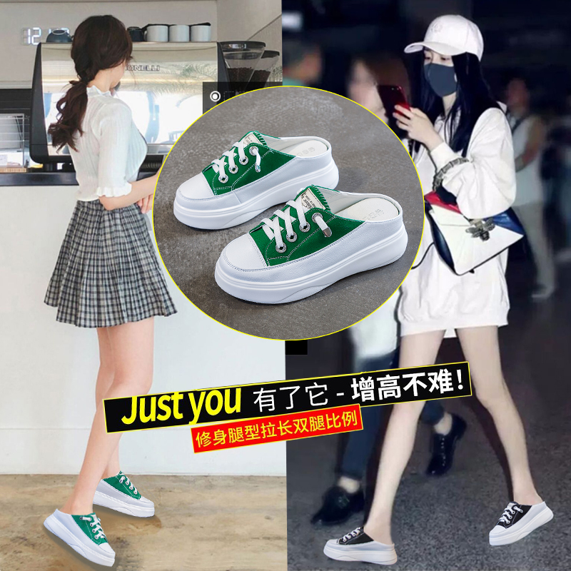 真皮包头透气半拖鞋女外穿春夏帆布百搭小白鞋松糕厚底内增高凉拖