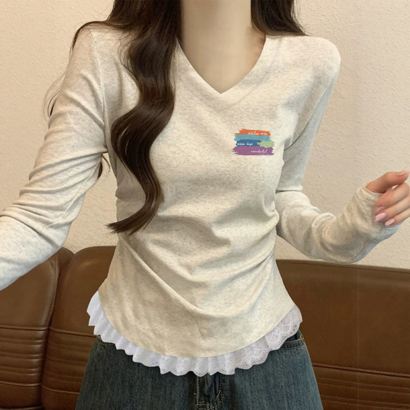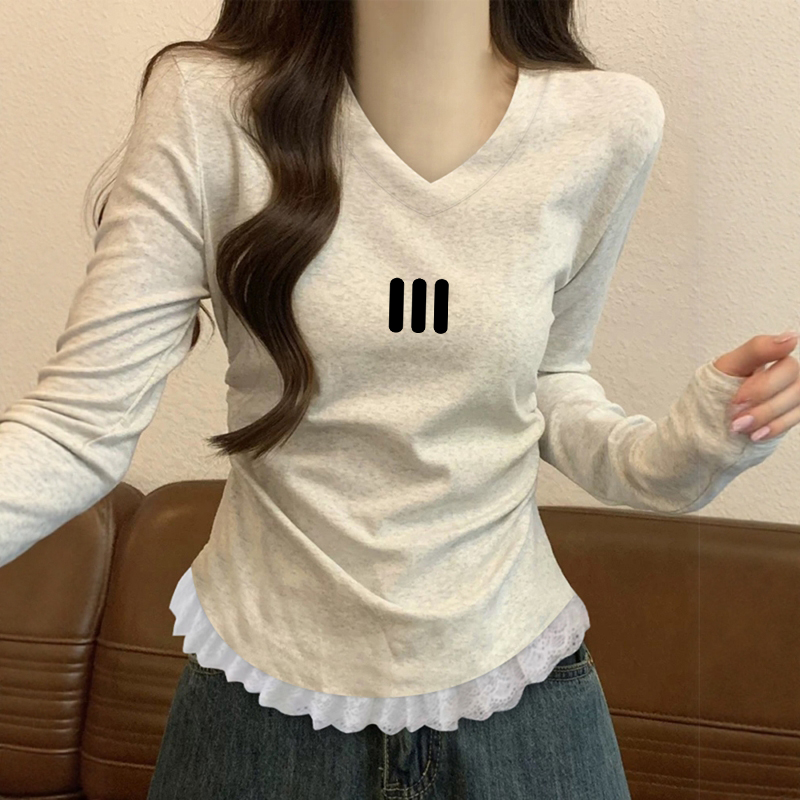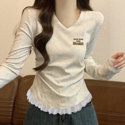 蕾丝花边v领长袖T恤女早秋2025新款独特别致巨好看掐腰短款打底衫