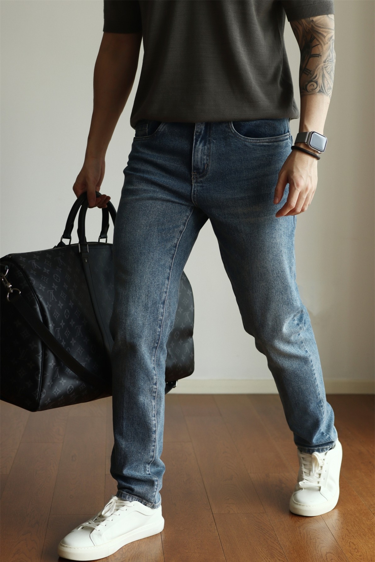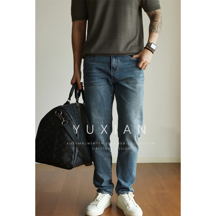 YUXIAN纯棉四面弹水洗丹宁牛仔裤锥形修身长裤休闲商务小脚复古春