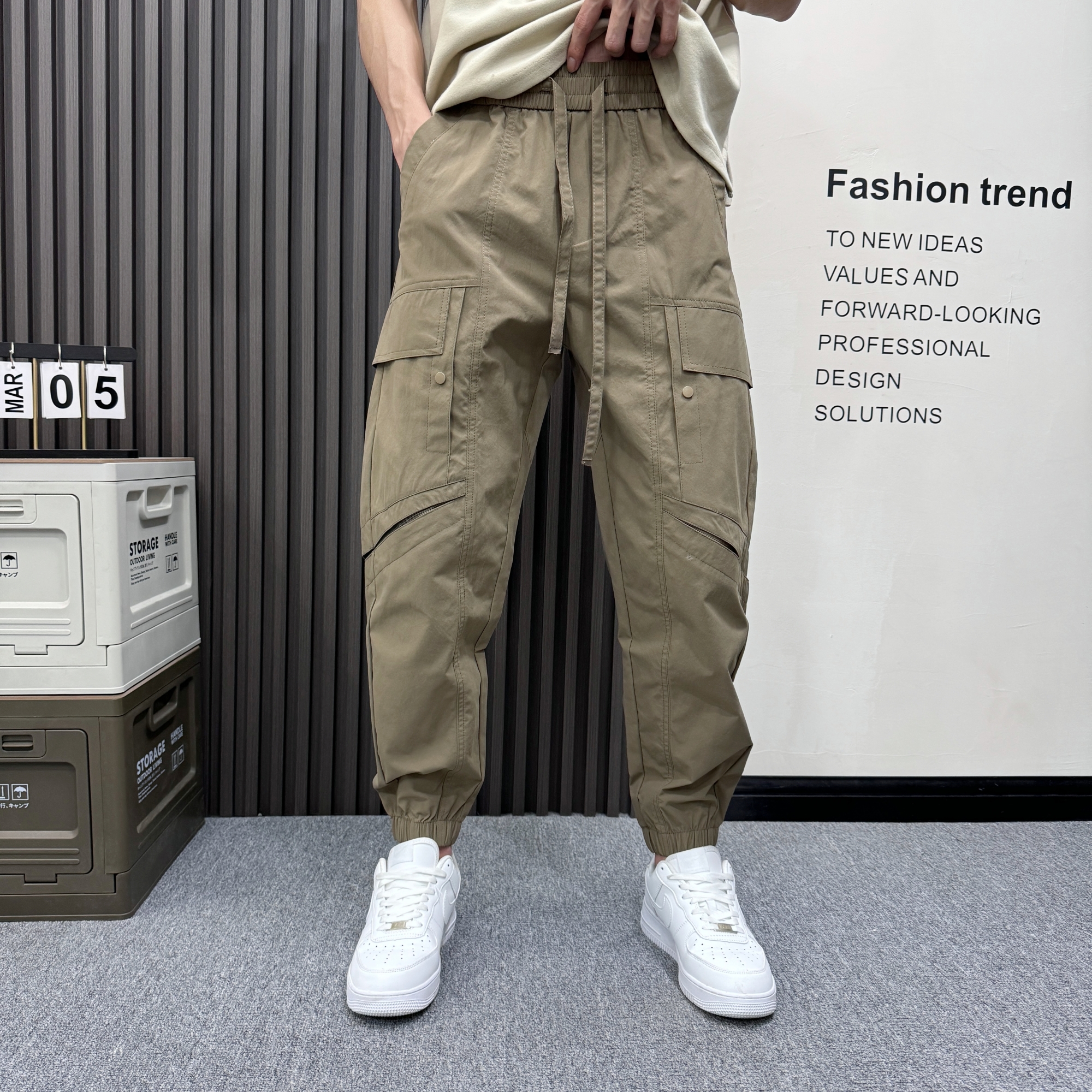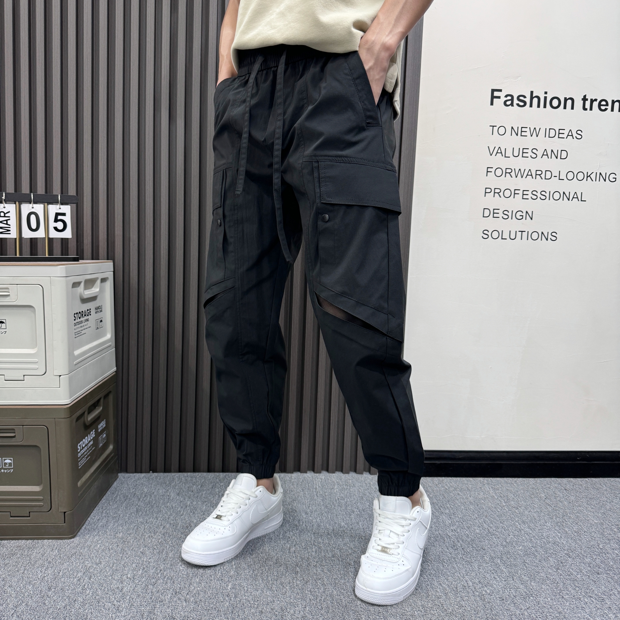 夏季网眼透气开衩休闲裤立体裁剪工装多口袋运动裤高街九分哈伦裤