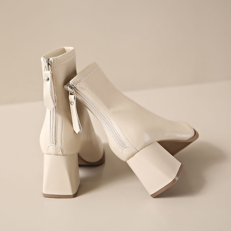 羊皮高跟短靴女2025秋冬新款时尚粗跟后拉链裸靴尖头弹力瘦瘦靴子