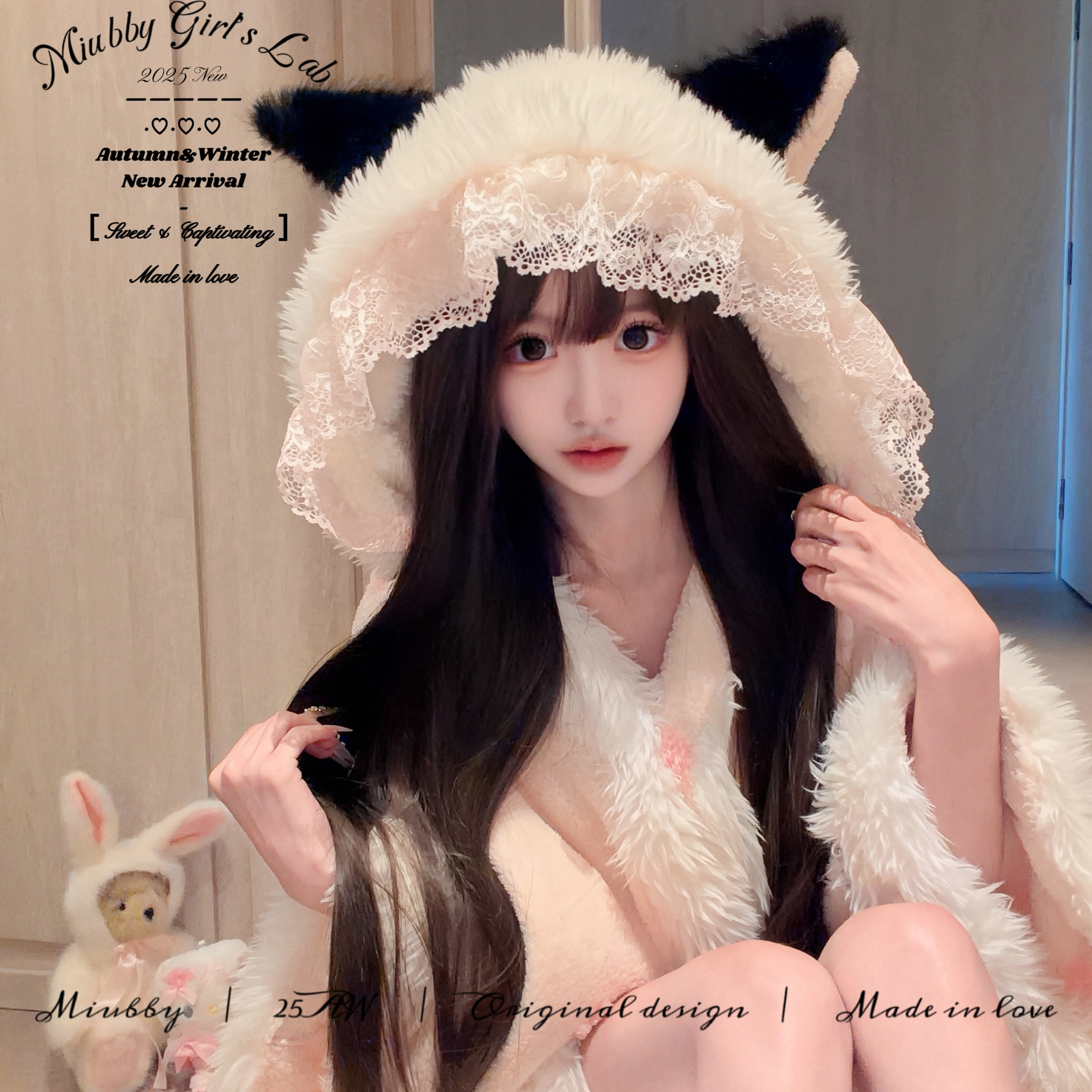 Miubby「糯叽小猫」冬季纯欲蕾丝猫耳连帽斗篷睡衣珊瑚绒加厚睡袍