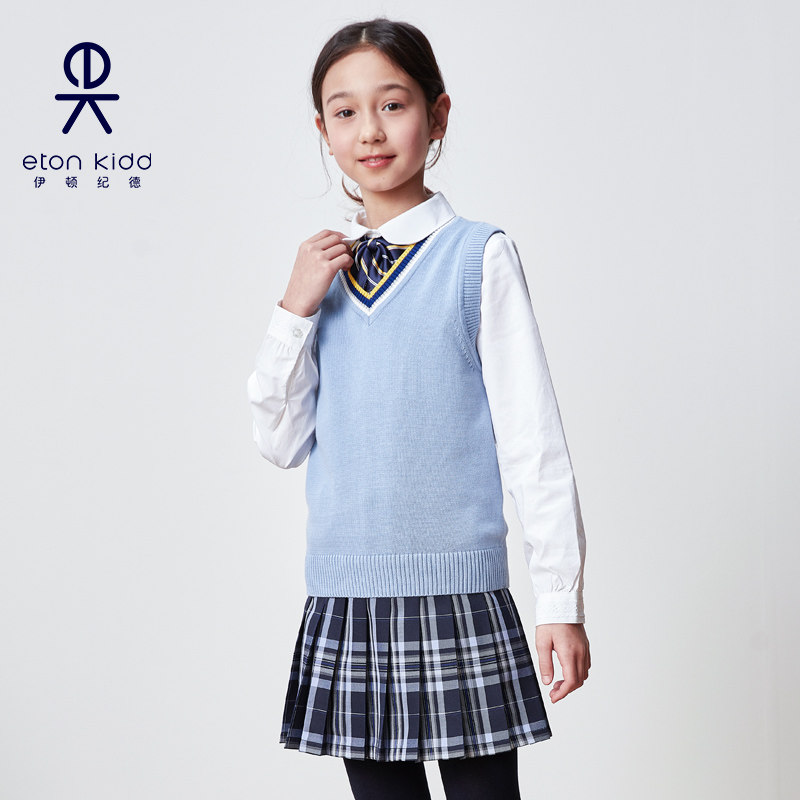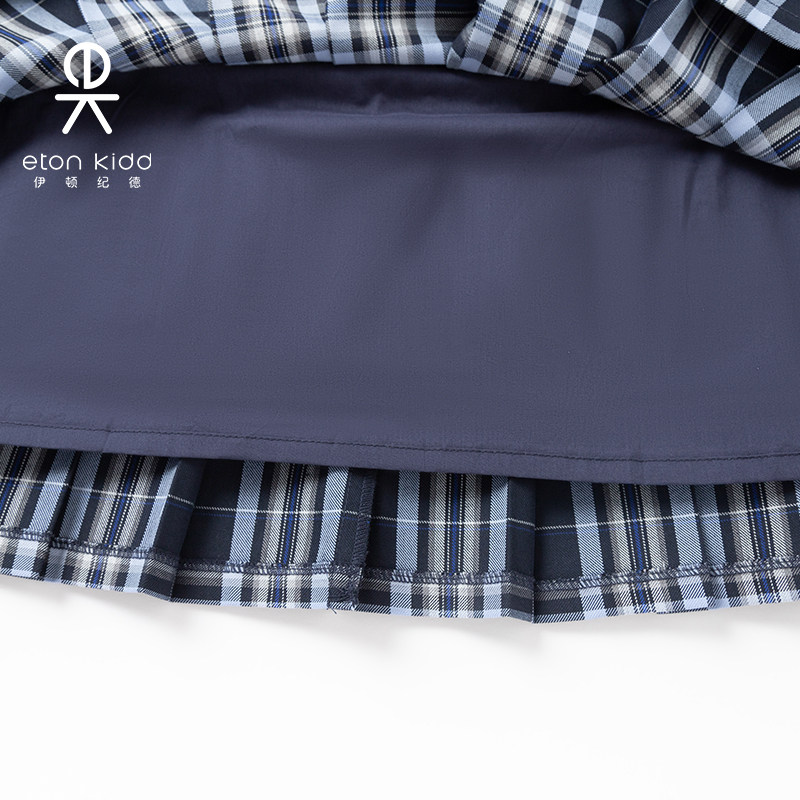 伊顿纪女童藏青蓝格百褶裙女生淑女格子半身裙子春季新款22Q2010