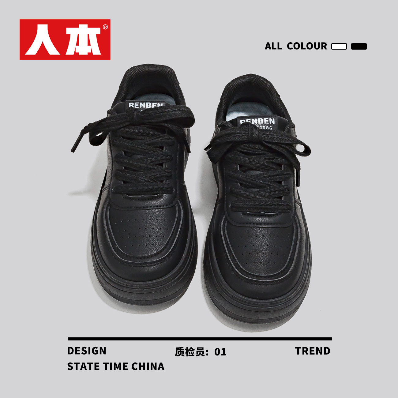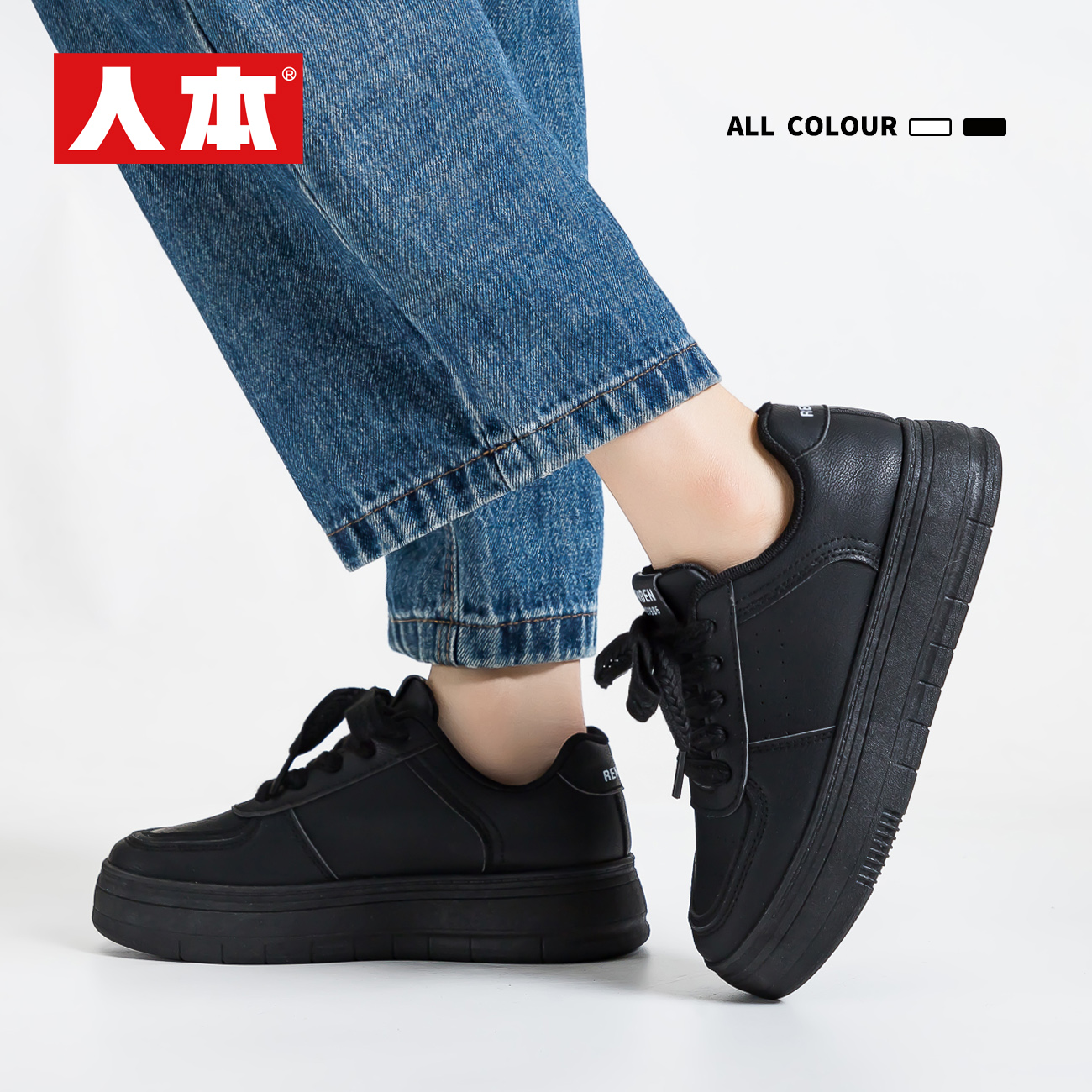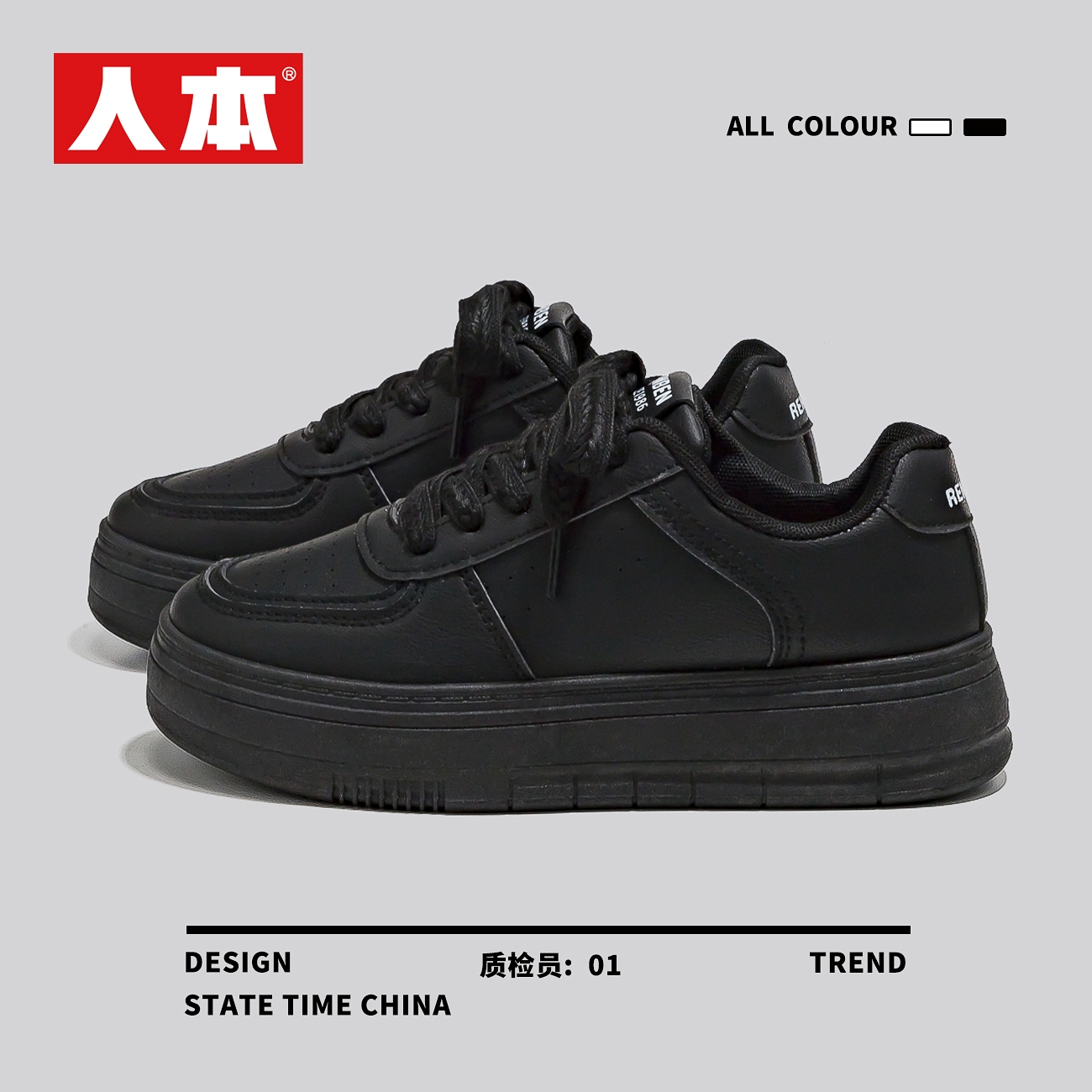 人本黑色板鞋女2025新款秋冬厚底小众设计鞋子运动休闲百搭小黑鞋