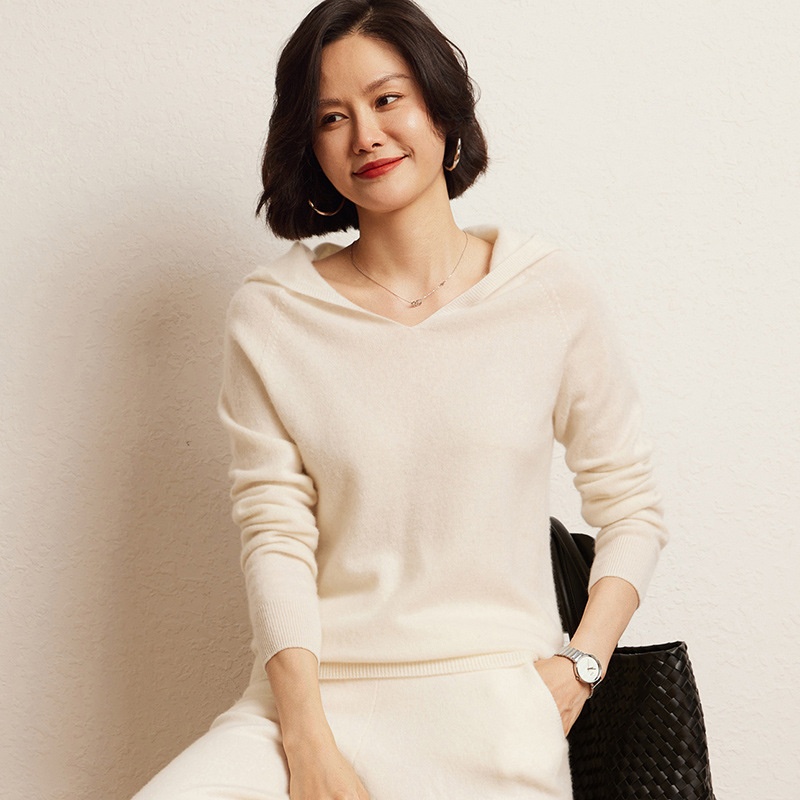 山羊绒2025秋冬女新款V字领帽衫纯色套头短款卫衣宽松针织衫毛衣