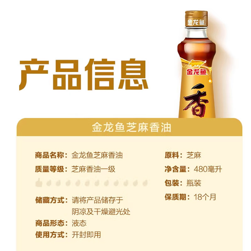 【K姐推荐】金龙鱼调料油纯芝麻油香油480ml火锅食用油大规格厨房