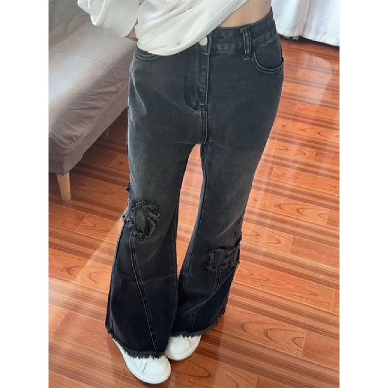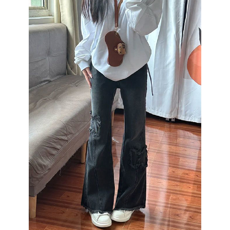 300斤大码胖mm学院风微喇牛仔裤女春秋蝴蝶刺绣裤子黑色毛边女裤