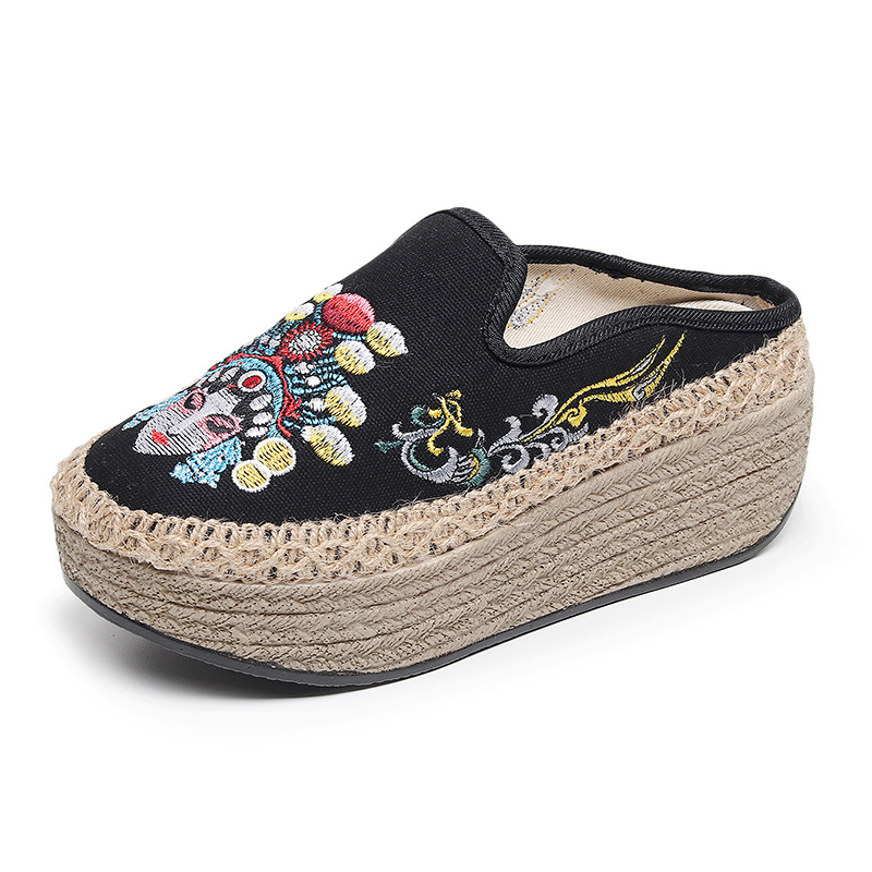 2025新款夏季京剧脸谱高跟坡跟中国风女拖鞋女凉鞋老北京绣花布鞋