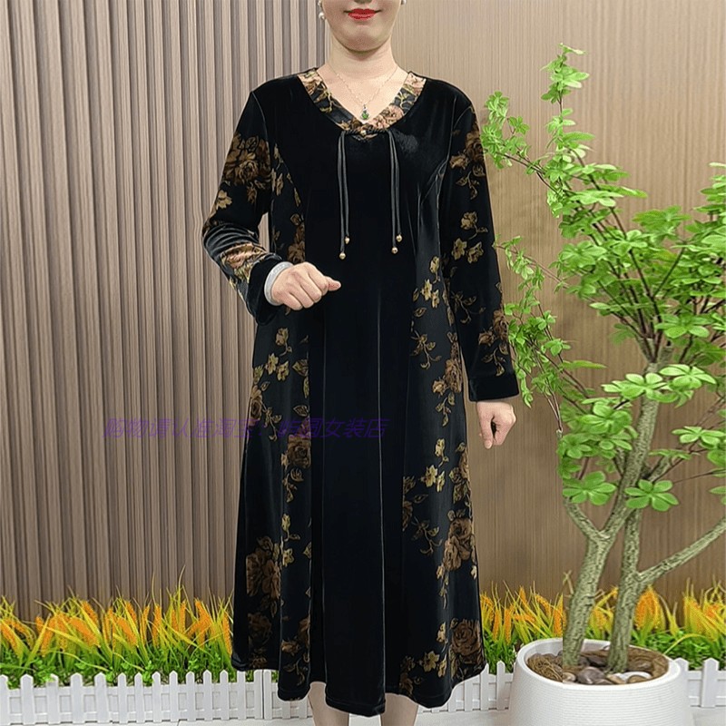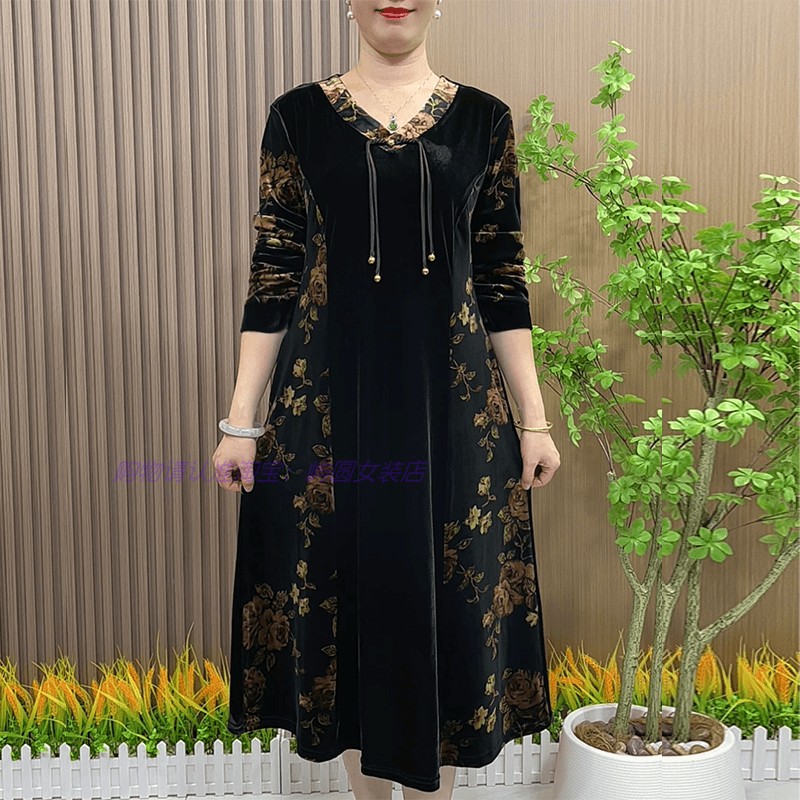 妈妈秋装洋气丝绒连衣裙中长款中老年女装秋季大码V领国风裙子