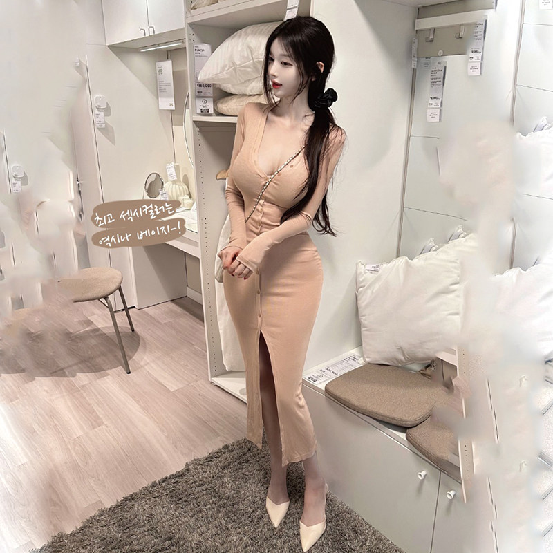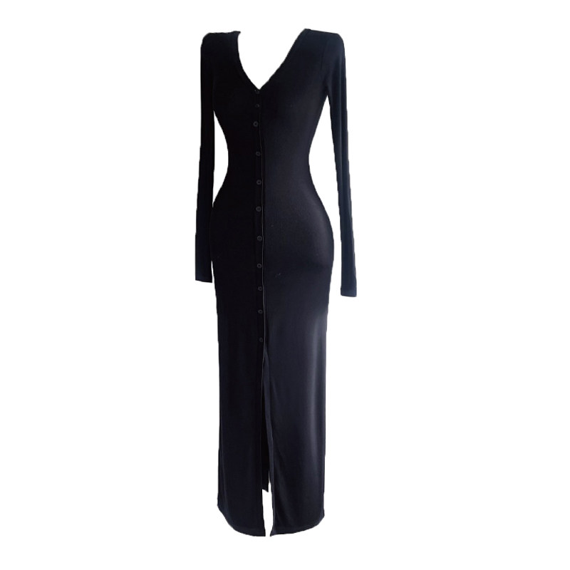 性感长袖连衣裙女装内搭韩国2025新款春秋修身深V领紧身包臀裙子