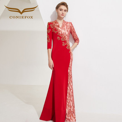 创意狐晚礼服长款红色订婚敬酒服新娘主持人高端新中式长袖宴会装