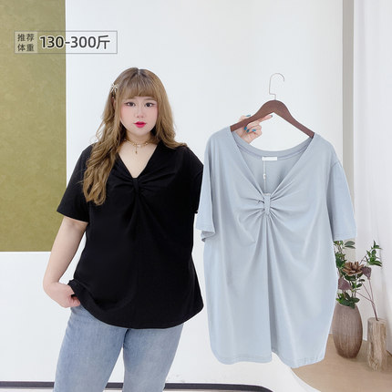 300斤胖莹莹大码女装韩系纯欲设计感简约扭结宽松V领正肩短袖T恤