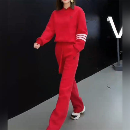 红色长袖卫衣运动套装女春秋季新款设计感休闲宽松直筒裤俩件套潮