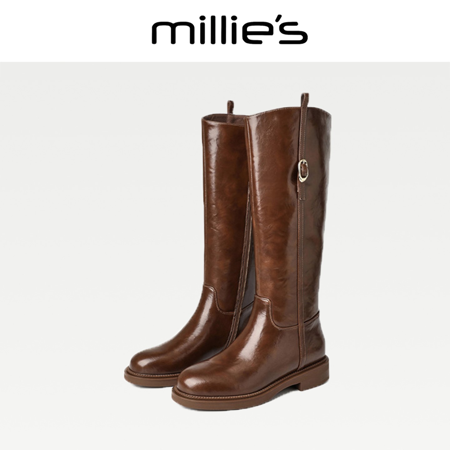 MILLIE'S/妙丽2025新款秋冬显瘦高筒靴皮带扣女粗跟厚底骑士靴CQ