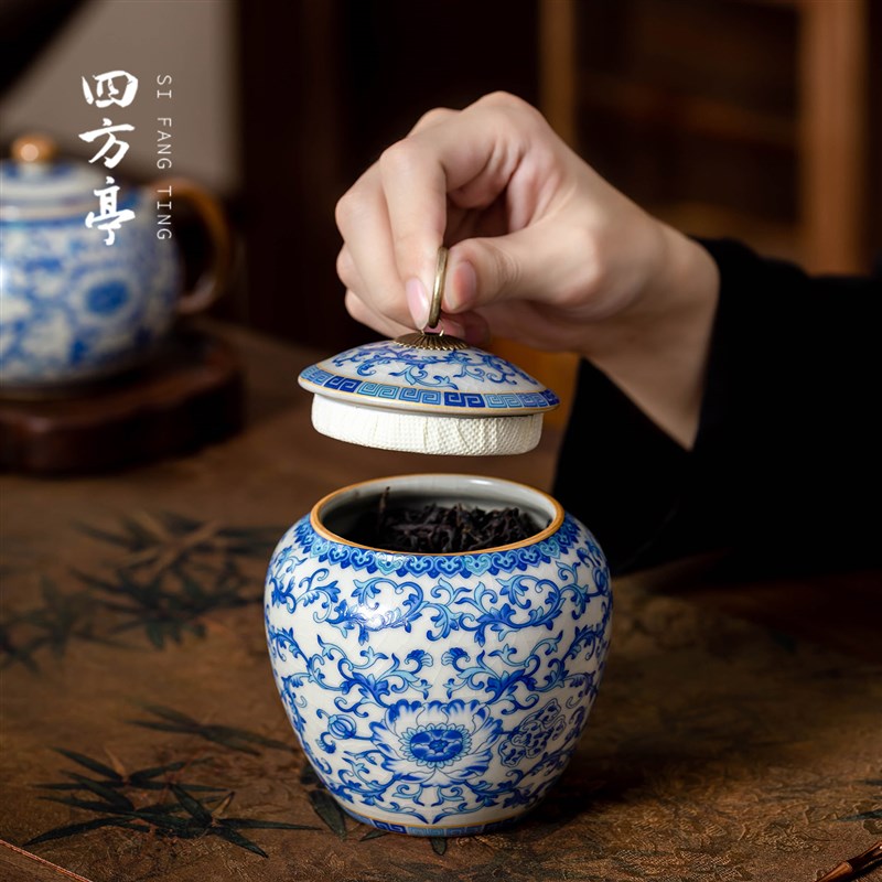 青花汝窑缠枝陶瓷茶叶罐高档绿茶白茶普洱茶防潮罐中式密封储存罐