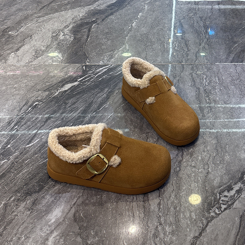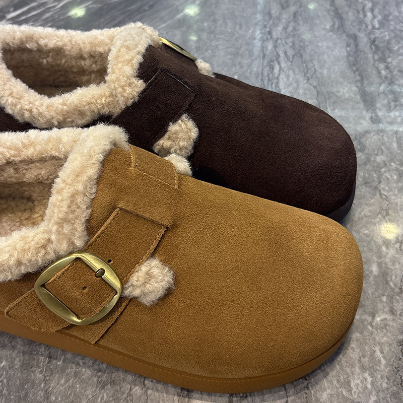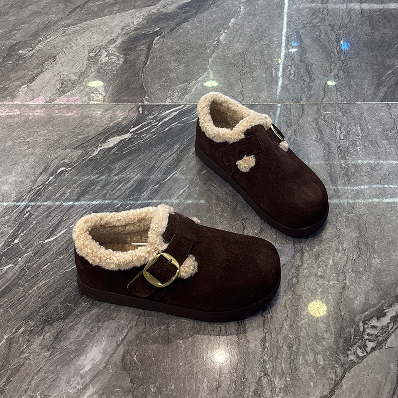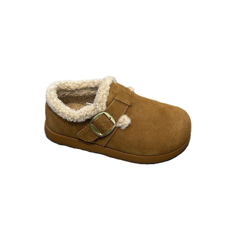 懒人穿搭~真皮软底丑萌勃肯鞋女2025冬新款皮带扣毛毛乐福鞋棉鞋
