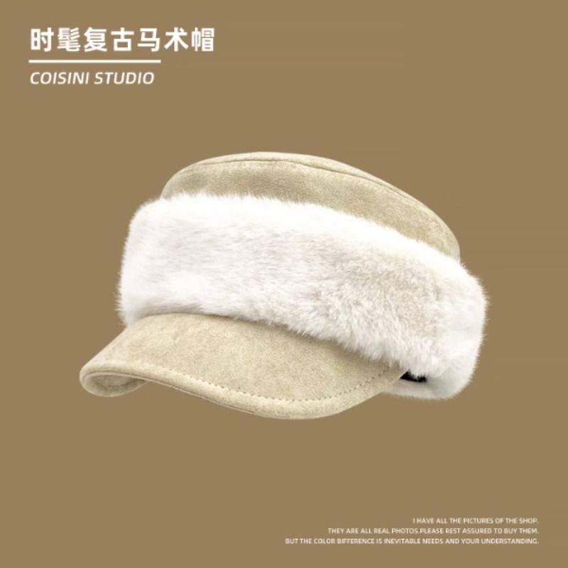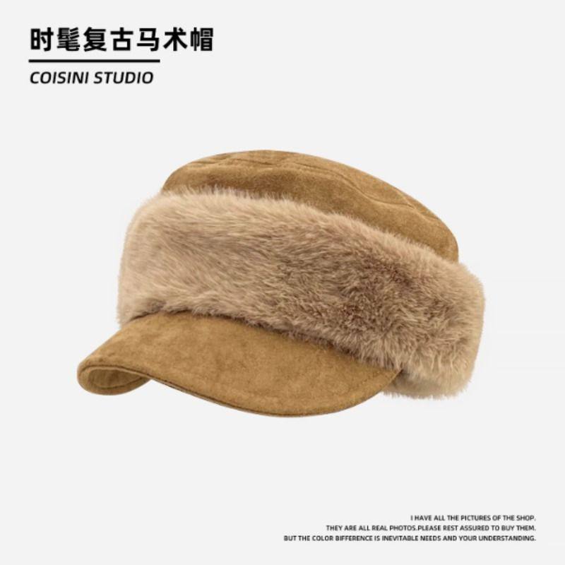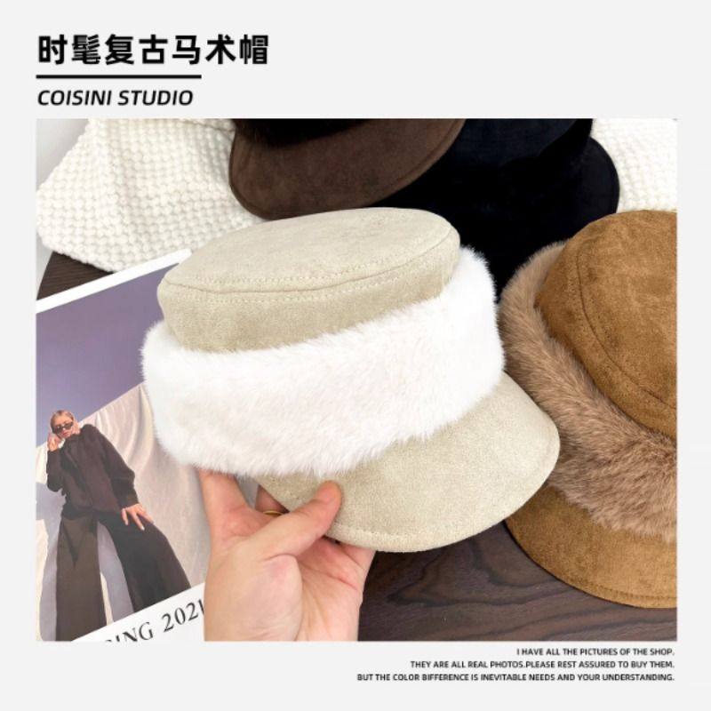 复古麂皮绒毛绒边马术帽女秋冬气质保暖百搭显脸小鸭舌帽子