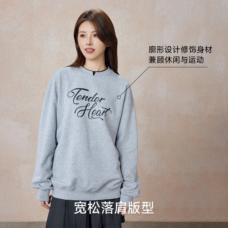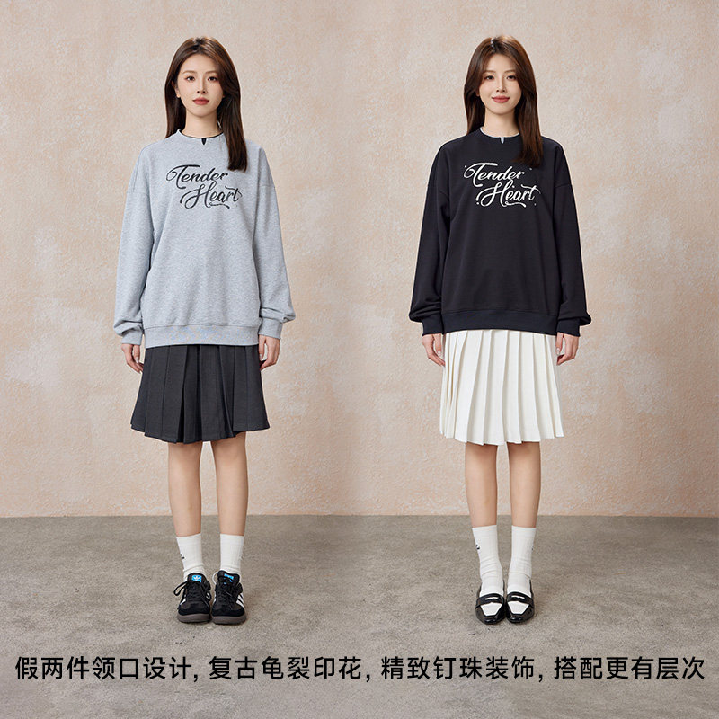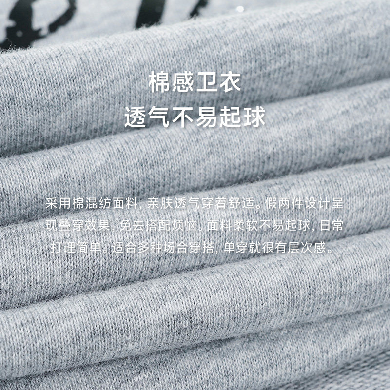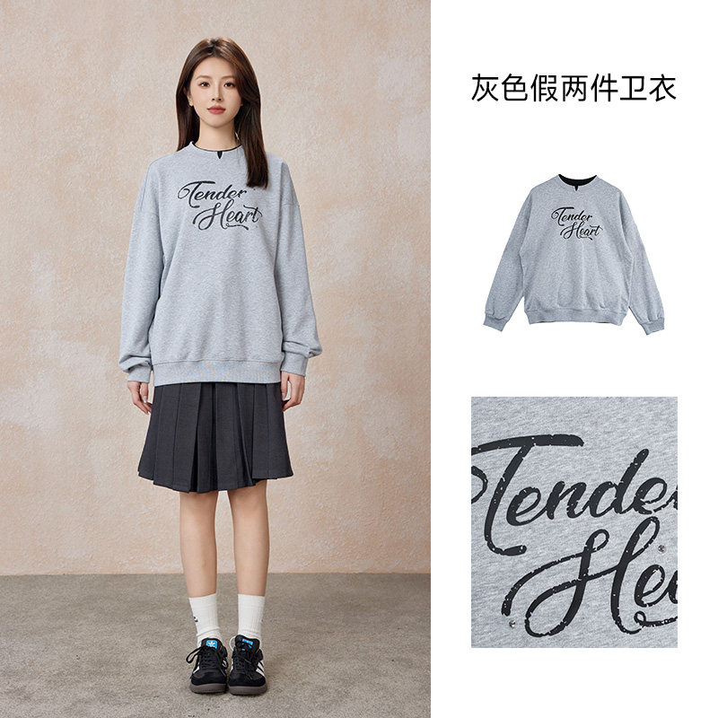 A21女装针织宽松圆领落肩假两件无绒底卫衣休闲风宽松型长袖上衣