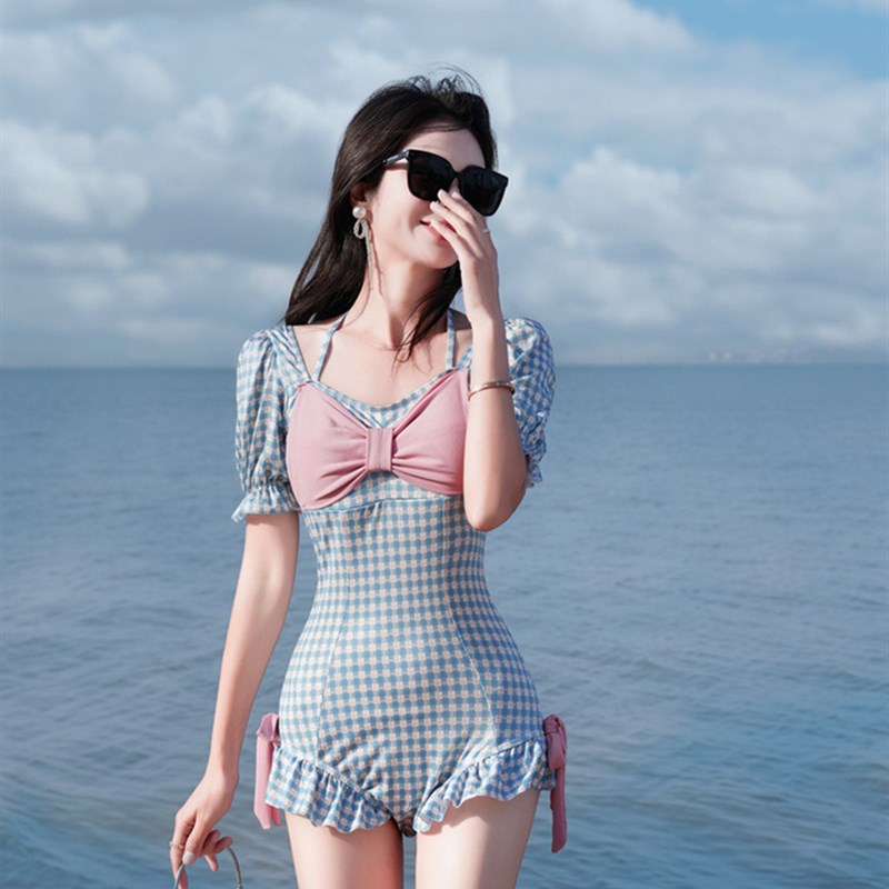 元气少女游泳衣女连体平角保守显瘦遮肚学生大蝴蝶结温泉泳装女