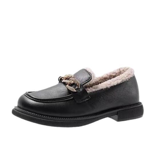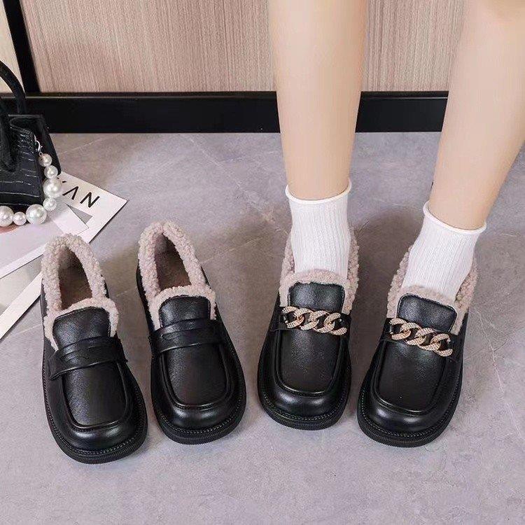 软皮英伦风小皮鞋女2025冬季新款加绒豆豆鞋女保暖棉鞋百搭乐福鞋