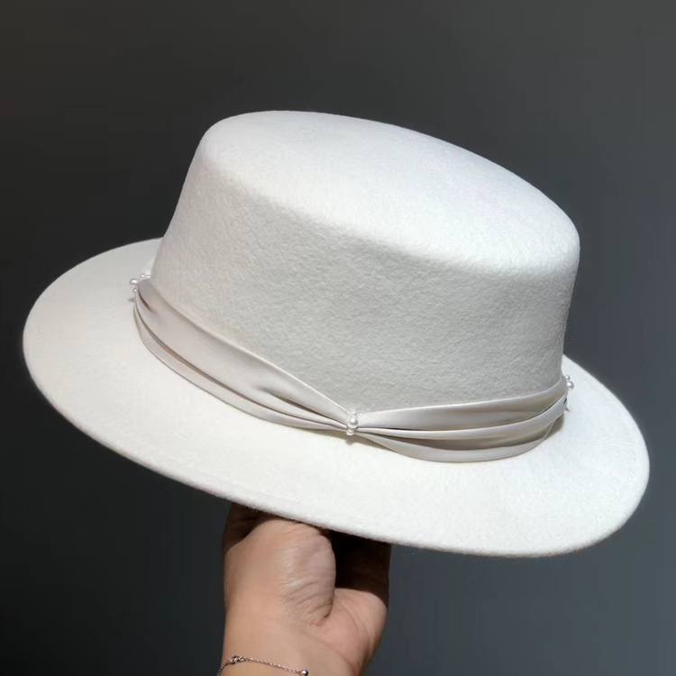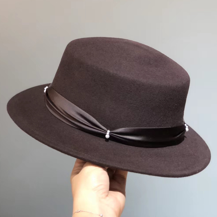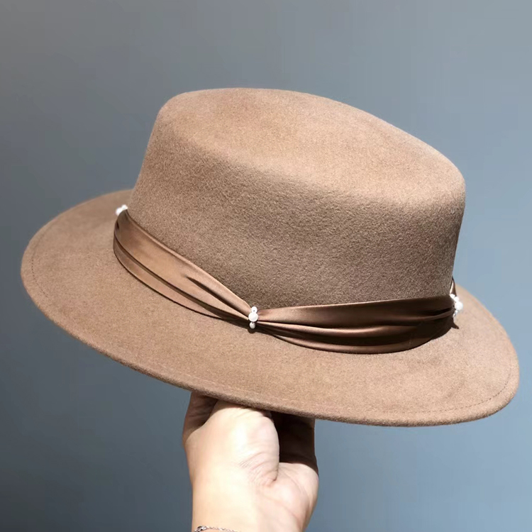澳洲秋冬新款平顶平檐羊毛呢毛毡礼帽ins帽子法式复古钉珠毡帽