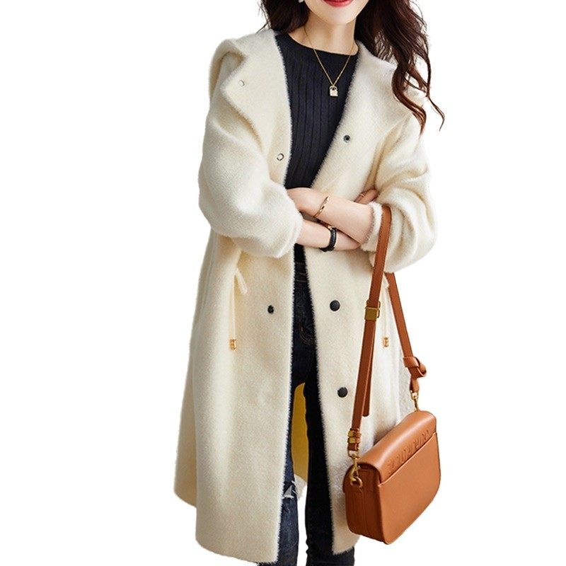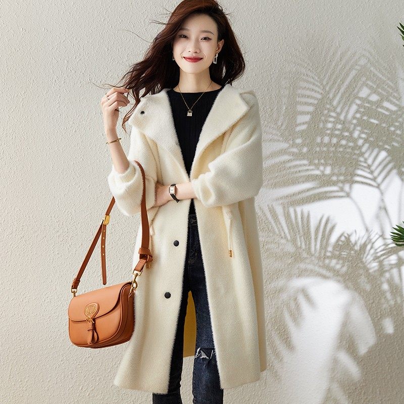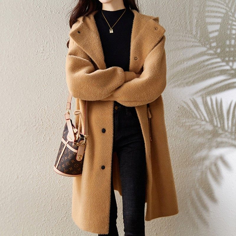 水貂绒毛呢外套女中长款连帽秋冬新款加厚韩版宽松黄金貂呢子大衣