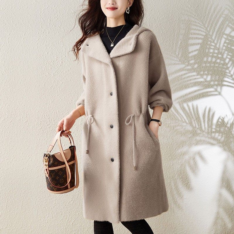仿水貂绒单排扣连帽外套抽绳