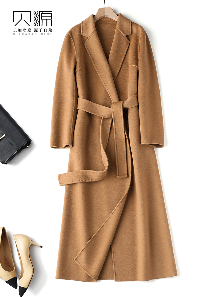 贝源2025新款加长款驼色双面羊绒大衣女慵懒风超长款羊毛毛呢外套