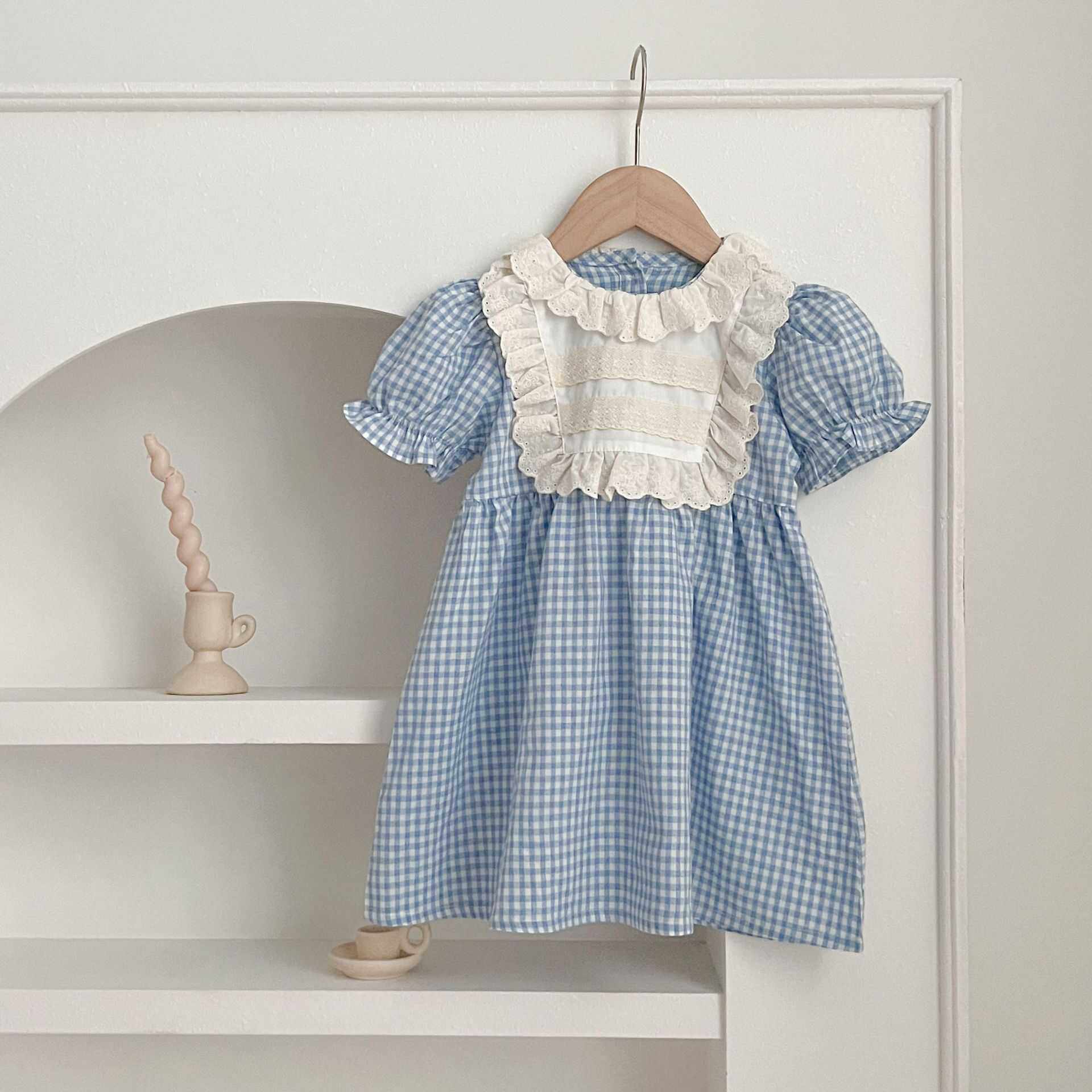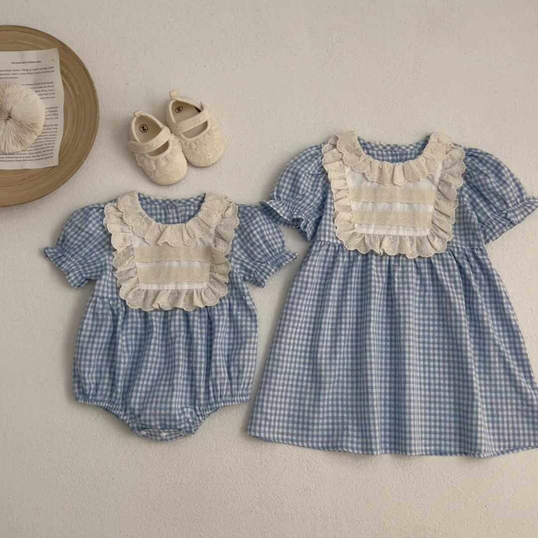夏天韩版婴儿宝宝格子蕾丝领包屁哈衣爬服女童连衣裙一大一小姐妹