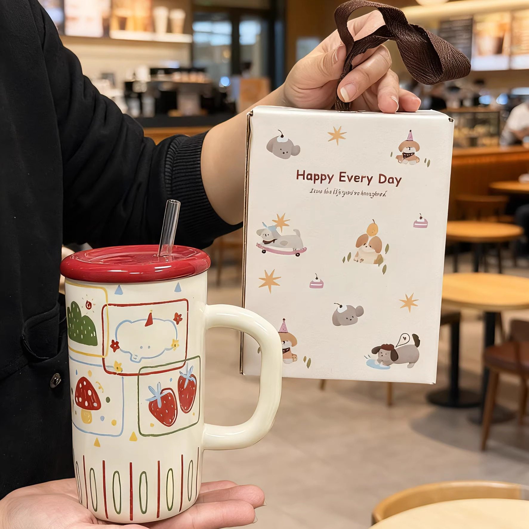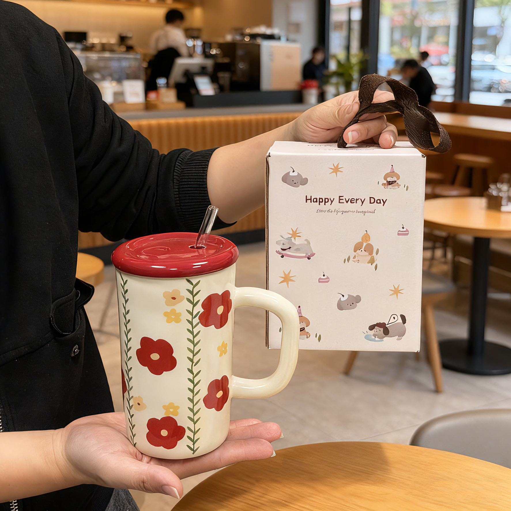 ins复古花朵杯子女生高颜值陶瓷马克杯带盖家用吸管水杯生日礼物