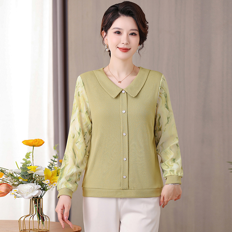 妈妈洋气翻领打底小衫中年女气质雪纺袖上衣中老年春秋装针织T恤