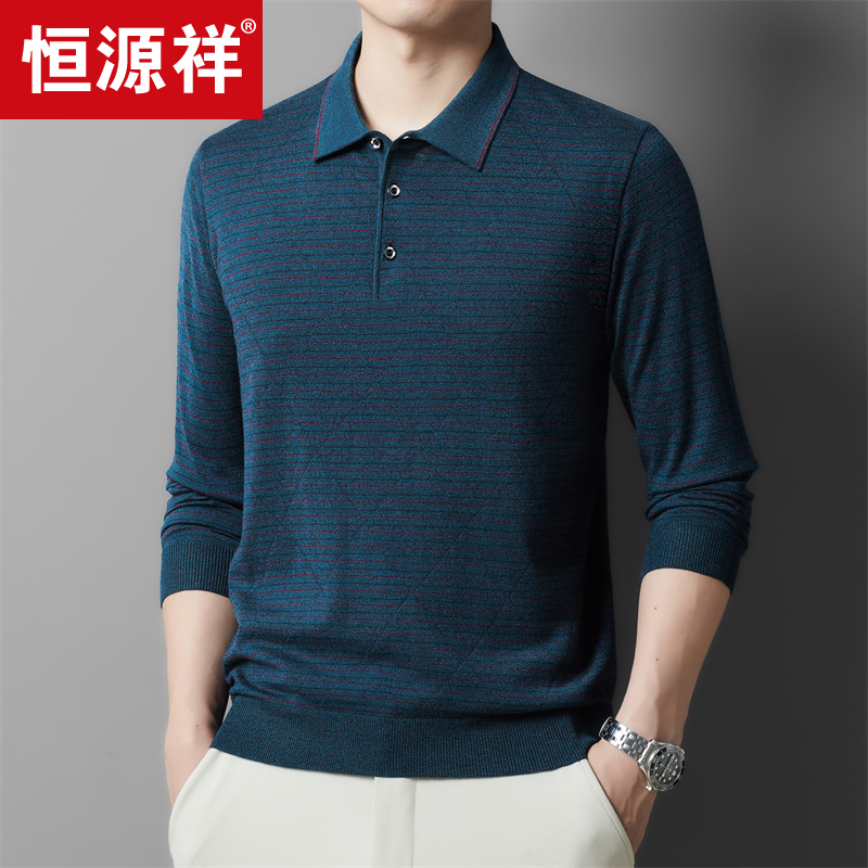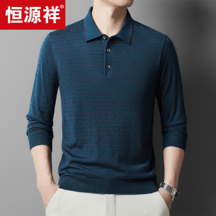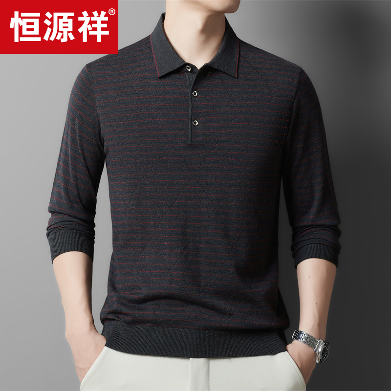 恒源祥秋季中年男士长袖T恤男装薄款翻领针织体恤衫含羊毛爸爸装